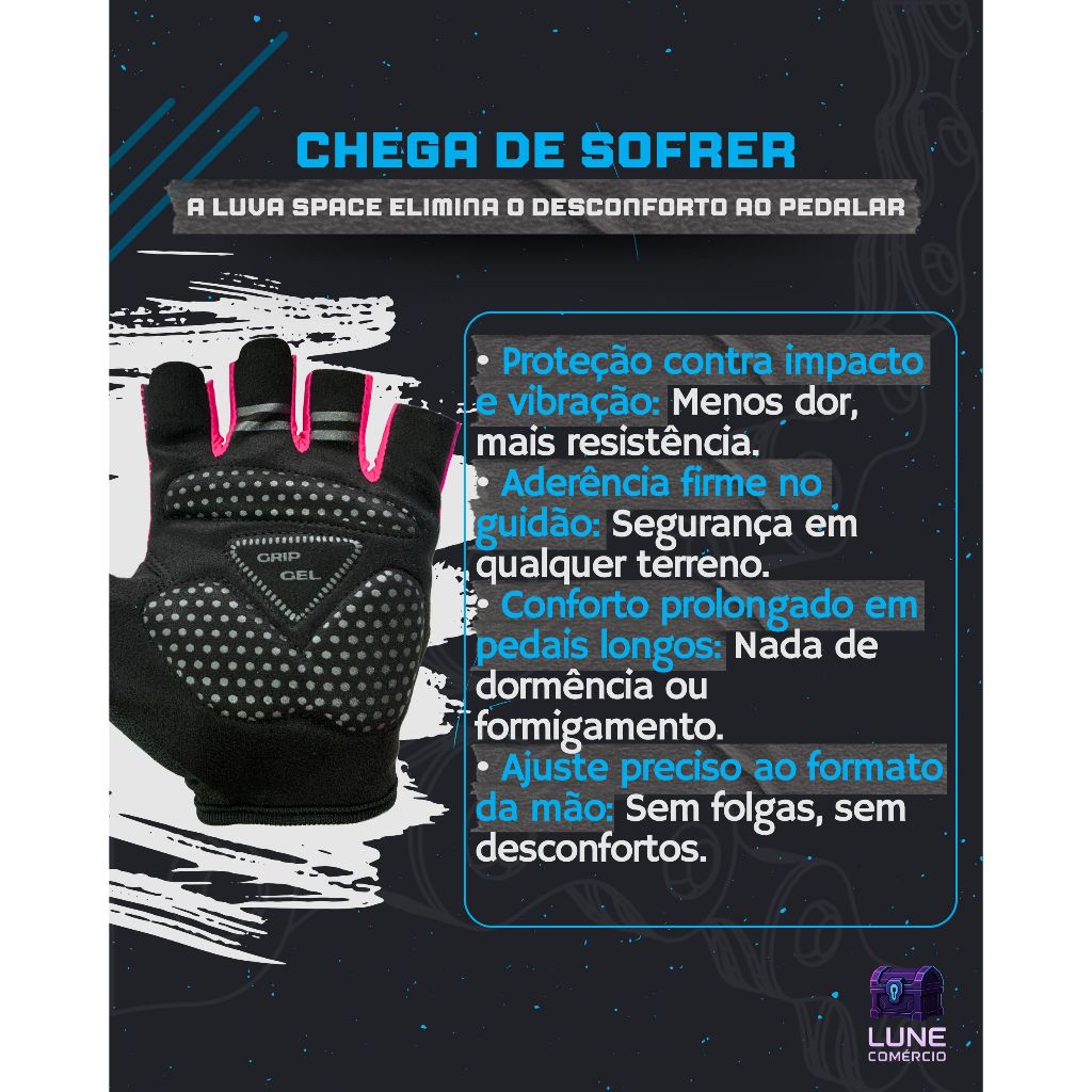 Chega de mãos doloridas: pedale com conforto e controle total Você ama pedalar, mas termina com as mãos formigando ou doloridas? A verdadeira causa? A falta de proteção contra os impactos constantes e vibrações do guidão, que sobrecarregam suas mãos e punhos — e isso acontece quando você não usa uma luva de bike própria para ciclismo. A Luva Bike Space elimina dores e traz conforto imediato • Adeus dormência e formigamento: proteção anti-impacto que reduz vibração e alivia a pressão nas mãos. • Aderência firme e segura: o grip antiderrapante garante controle total do guidão. • Pedaladas mais longas e confortáveis: tecido respirável e toque macio, mesmo sob o sol. • Ajuste preciso ao formato da sua mão: ergonomia perfeita, sem folgas ou incômodos. • Unissex e versátil: ideal como luva ciclismo masculina ou luva ciclismo feminina. Especificações Técnicas: • Velcro Premium com ajuste anatômico: firmeza total, sem escorregar. • Tecido frontal em poliamida com silk grafite: flexível, leve e resistente. • Palma em camurça com espuma anti-impacto: absorve trepidações e choques com eficácia. • Detalhes em Silk Grip Gel antiderrapante: segurança até em terrenos molhados, com suor ou lama. • Dedão Pluma: Material macio e absorvente para enxugar o suor do rosto. • Design ergonômico unissex: adaptação precisa a diferentes formatos de mão. • Produção Nacional com Qualidade: Fabricada no Brasil com materiais de alta qualidade. Indicação: luva bike MTB, estrada ou urbana. Conteúdo da embalagem: - 1 par de luvas de bike Space Perguntas Frequentes – Tire suas dúvidas antes da compra: • Serve para qualquer tipo de pedal? Sim, a luva para bicicleta é perfeita para trilhas, estrada e cidade. • É unissex? Sim! A modelagem se adapta tanto a mãos masculinas quanto femininas. • A luva esquenta as mãos? Não. O tecido é leve e respirável, ideal para pedais longos. • A luva escorrega com o suor ou na chuva? Não. O grip em gel garante total aderência ao guidão. • Tem garantia? Sim, 3 meses de garantia direta com o fabricante. • Qual tamanho devo escolher? Consulte a tabela de medidas e escolha o tamanho ideal para a sua mão. Essa é a luva ciclismo ideal para ciclistas que buscam desempenho sem abrir mão do conforto. Seja no asfalto, na trilha ou no dia a dia, as luvas ciclistas Space são o upgrade que suas mãos merecem.