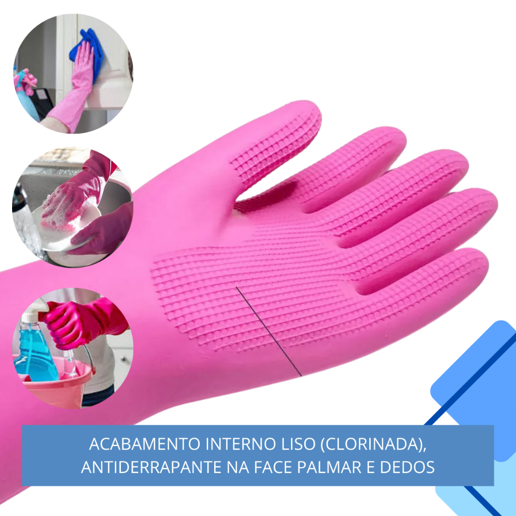 Luva Látex Ranhurada Rosa, confeccionada em látex de borracha natural, com acabamento interno clorinado e formato anatômico. Possui palma e dedos antiderrapantes, oferecendo excelente aderência e segurança no manuseio. Conta com cano longo para maior proteção do antebraço, é reutilizável, resistente e confortável para uso profissional. Indicada para serviços de limpeza, higienização, indústria alimentícia, frigoríficos, hospitais, laboratórios, jardinagem, saneamento e uso geral. Produto com CA 36368, disponível nos tamanhos P, M, G e EG. Tamanhos e Comprimentos - 7 (P): 32 cm - 8 (M): 39 cm - 9 (G): 40 cm - 10 (EG): 42 cm Contém látex de borracha natural, pode causar alergia em pessoas sensíveis.