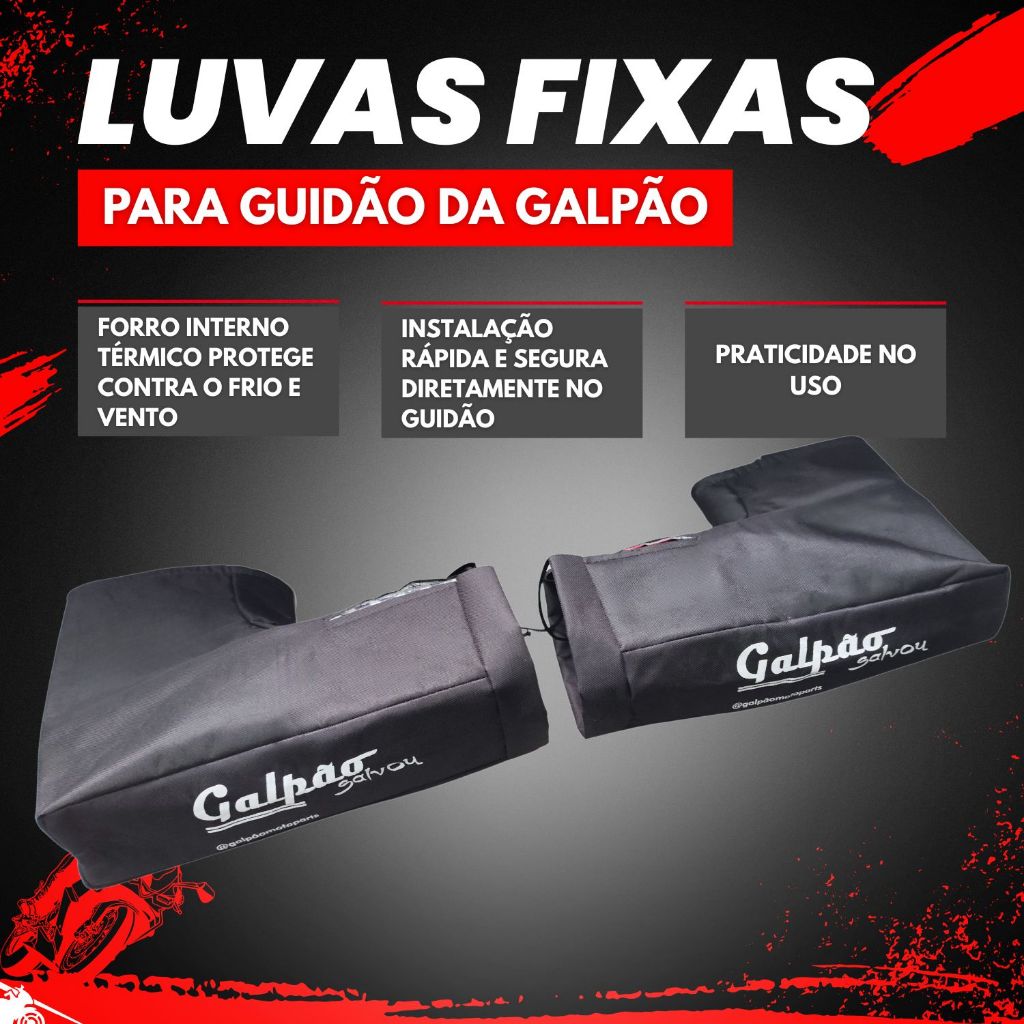 Luva Fixa Guidão Com Forro Térmico Universal Para Motos Galpão ou Protercapas PRINCIPAIS VANTAGENS: • Forro interno térmico que protege contra o frio e vento • Instalação rápida e segura diretamente no guidão • Compatível com a maioria das motos (design universal) • Aumenta o conforto e a segurança na pilotagem APLICAÇÕES: Guidão de moto universal. Compatível para a maioria das motos. !!!!!!!!!!!!!!! NÃO SERVIRÁ PARA MOTOS COM PROTETOR DE DEDOS EM VOLTA DO MANETE !!!!!!!!!!!!!!! As luvas fixas de guidão Protercapas oferecem praticidade no uso, pois não precisam ser colocadas e retiradas a todo momento. Podem ficar instaladas na motocicleta por quanto tempo for necessário, não gerando a necessidade de se retirar a todo momento como acontece com as luvas de mão convencionais. Protege totalmente suas mãos do frio e da chuva. Além da proteção e da praticidade, garante segurança no uso, pois não diminui os movimentos das mãos e garante total liberdade na pilotagem da motocicleta. Possuem ainda logo refletiva para maior segurança nos passeios noturnos. Qualidade e originalidade. Os produtos Protercapas são fabricados com tecidos com alta concentração de poliéster, o que garante mais elasticidade e resistência às condições climáticas e de uso em geral. Os moldes Protercapas seguem o mesmo design dos modelos originais. Os tecidos utilizados possuem gramatura e textura muito próximo dos originais de fábrica. As capas são impermeáveis sem costura, pois é utilizado o processo de vulcanização. Nos modelos costurados, é utilizado um processo de reforço da costura para gerar ainda mais resistência e durabilidade. Os tecidos utilizados na fabricação junto com a metodologia de corte, permitem ao cliente uma montagem fácil e rápida. CONTEÚDO EMBALAGEM: • 1x Par de Luvas Fixas de Guidão do modelo escolhido (Galpão ou Protercapas) SEGUE APLICAÇÃO DE ALGUMAS MOTOS: Honda: Start 160 - Fan 160 - Fan 150 - Fan 125 - CG Titan 160 - CG Titan 150 - CG Titan 125 - CG 125 - Turuna - ML - NXR 160 Bros NXR 150 Bros - NXR 125 Bros - XR 250 Tornado - XRE 300 - CB 300 - CBX 250 Twister - CBX 200 Strada - Cargo - Yamaha XTZ 125 - XTZ 250 Lander - YBR 125 - Factor 125 - Factor 150 - Tenere 250 Dafra Speed 150 - Apache 150 - Super 50/100 - Riva 150 Suzuki Yes 125 Sundown Max 125 - SXT 200 - Motard !!!!!!!!!!!!!!! IMAGENS MERAMENTE ILUSTRATIVAS !!!!!!!!!!!!!!! SOBRE NOSSA EMPRESA: Somos uma organização com anos de experiência no mercado. Seja você um apaixonado por velocidade, um aventureiro de estrada ou um entusiasta da personalização, cumprimos a missão de fornecer peças e acessórios da mais alta qualidade para elevar sua experiência de pilotagem a um novo patamar. UTILIZE O CAMPO DE PERGUNTAS PARA TIRAR SUAS DÚVIDAS, e apenas confirme a compra em caso de CERTEZA de compatibilidade do produto! CÓDIGOS: Protercapas: COD_17637/ Galpão: COD_15420