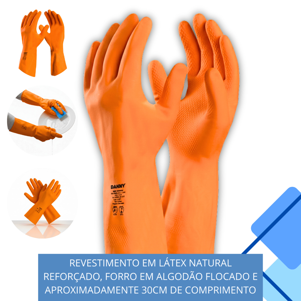 LUVA DANNY MAX ORANGE DA208D - CA: 11.286 Luva de látex reforçada BENEFICIOS - Maior resistência química e abrasiva - Alta aderência para atividades com umidade - Forro aveludado para maior conforto - Proteção térmica até 250ºC* DESCRIÇÃO A luva Max Orange é fabricada em látex natural e conta com espessura reforçada, que proporciona maior resistência abrasiva e maior proteção contra produtos químicos. A palma possui antiderrapante, que oferece maior segurança ao manusear objetos secos ou úmidos. (*) Para mais informações, consulte a ficha técnica. APLICAÇÕES - Atividades de montagem e manutenção - Serviços de limpeza - Ideal para atividades em imersão - Indústria química, alimentícia e agrícola