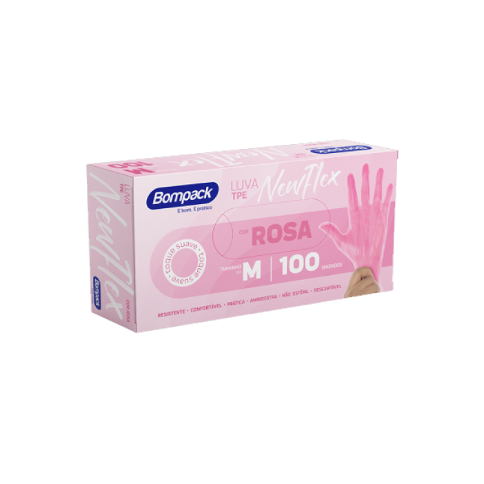 A Luva NewFlex Bompack é a escolha ideal para quem busca praticidade, conforto e higiene no dia a dia. Produzida em material TPE de alta qualidade, é ambidestra, resistente, flexível e sem látex, sendo indicada para uso profissional e doméstico. ✔ Material: TPE (Elastômero Termoplástico) ✔ Ambidestra e Descartável ✔ Confortável e resistente a rasgos ✔ Não possui pó e não contém látex ✔ Ajuste confortável sem apertar ✔ Uso prático e higiênico 📍 Indicações de uso - Salões de beleza - Manicure / Pedicure - Procedimentos estéticos - Cozinha e manipulação de alimentos - Limpeza leve Barbeiros / Spa / Clínicas 📦 Conteúdo da embalagem 1 Caixa com 100 unidades As cores disponíveis podem variar conforme estoque (Rosa, Transparente, Preta). 🔍 Por que escolher a NewFlex Bompack? Marca confiável e reconhecida Excelente custo-benefício Toque confortável e melhor sensibilidade Alternativa prática às luvas de vinil, látex ou nitrílica para usos gerais ⚠ Observações Produto não indicado para procedimentos médicos ou hospitalares. Uso não estéril.