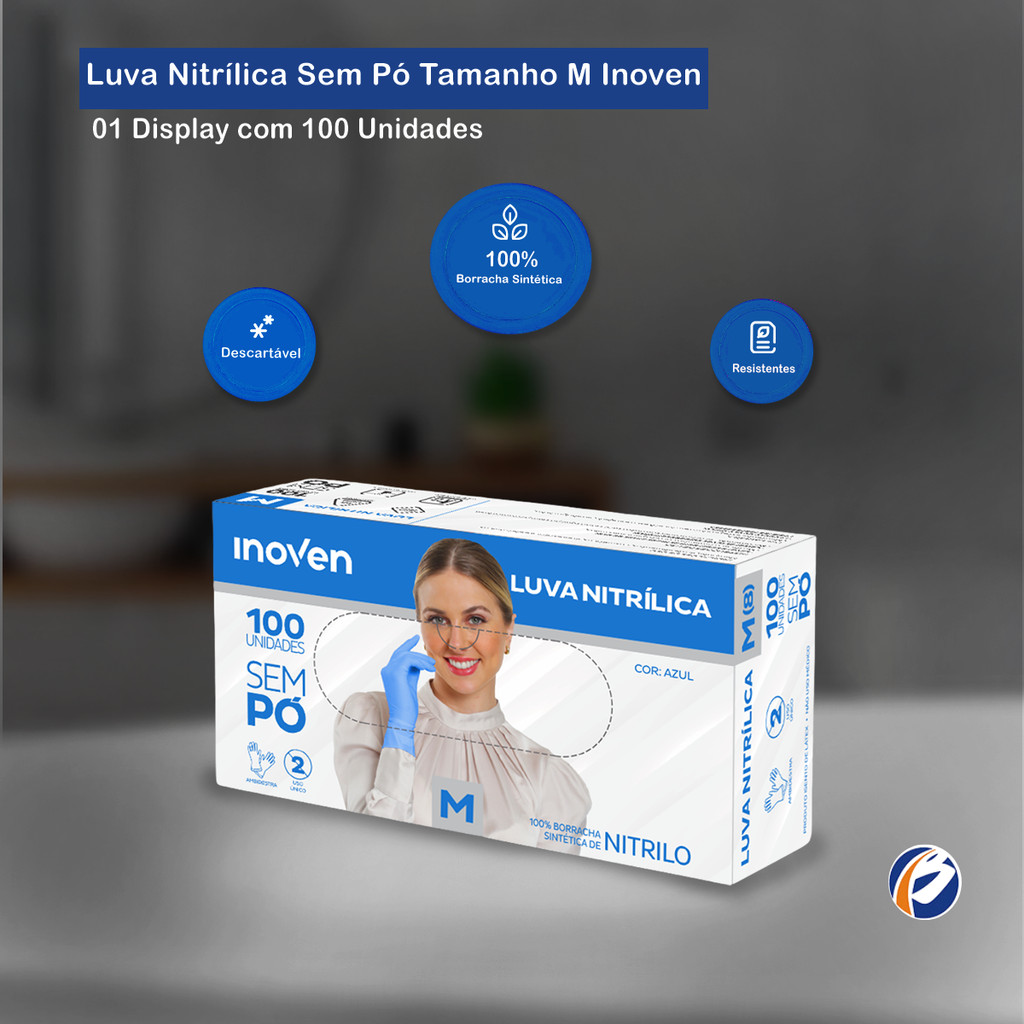 Luva Nitrílica sem Pó Azul M CA 45345 com 100 unidades Inoven Luvas para proteção das mãos confeccionadas em borracha nitrílica, superfícies lisas, pontas dos dedos texturizadas, sem pó, livres de látex, ambidestras, com bainha, não estéreis e de uso único. Produzidas em ambiente controlado, com baixa concentração de partículas no ar para aplicações que exijam os mais altos níveis de limpeza para proteção dos produtos a serem fabricados. Possui resistência mecânica três vezes maior do que o látex ou vinil/PVC. Indicação de Uso: - Deve ser utilizado em Exames, procedimentos gerais, procedimentos gastronômicos, estéticos e indústrias em geral. CA: 45345 Tamanho: M Embalagem: 01 display com 100 unidades