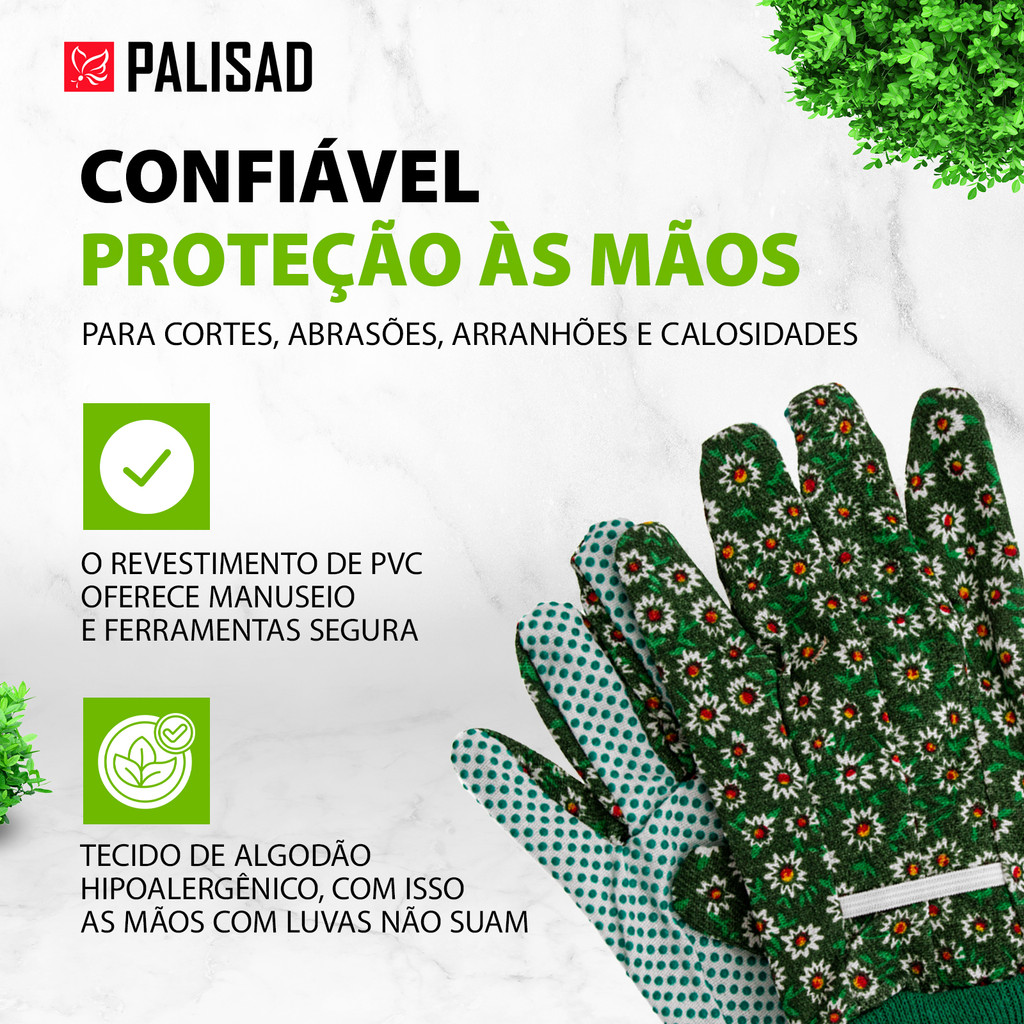 Luvas de Jardim Palisad 677628 (Tamanho M) As Luvas de Jardim Palisad 677628 são o acessório essencial para qualquer jardineiro que busca conforto, proteção e funcionalidade. Confeccionadas em tecido 100% algodão de alta qualidade, com pontos de PVC estrategicamente aplicados, essas luvas são ideais para trabalhos em jardins e hortas, protegendo as mãos contra cortes, arranhões, abrasões e calos. Principais Vantagens: Conforto Respirável: O tecido de algodão garante excelente ventilação, mantendo as mãos frescas e secas mesmo durante longas horas de trabalho, evitando o excesso de suor. Aderência Superior: Os pontos de PVC nas palmas e dedos aumentam a aderência, proporcionando firmeza e segurança no manuseio de ferramentas, evitando escorregões e garantindo precisão nas tarefas. Ajuste Seguro: O punho com dupla faixa elástica assegura um encaixe firme ao redor do pulso, impedindo que as luvas deslizem durante o uso e oferecendo maior conforto e segurança. Segurança e Hipoalergenicidade: O algodão é um material naturalmente hipoalergênico, ideal para peles sensíveis, minimizando o risco de irritações e alergias, para um uso tranquilo e prolongado. Conforto Tátil: A combinação do algodão macio com os pontos de PVC permite proteger as mãos sem perder a sensibilidade tátil, facilitando o manuseio delicado de plantas e ferramentas. Versatilidade: Perfeitas para jardinagem, hortas, uso doméstico e trabalhos em casas de campo, oferecendo proteção eficiente em diversas atividades. Em suma, as Luvas de Jardim Palisad 677628 são a escolha certa para quem deseja unir proteção, conforto e praticidade, garantindo mãos protegidas e confortáveis durante todas as tarefas no jardim.