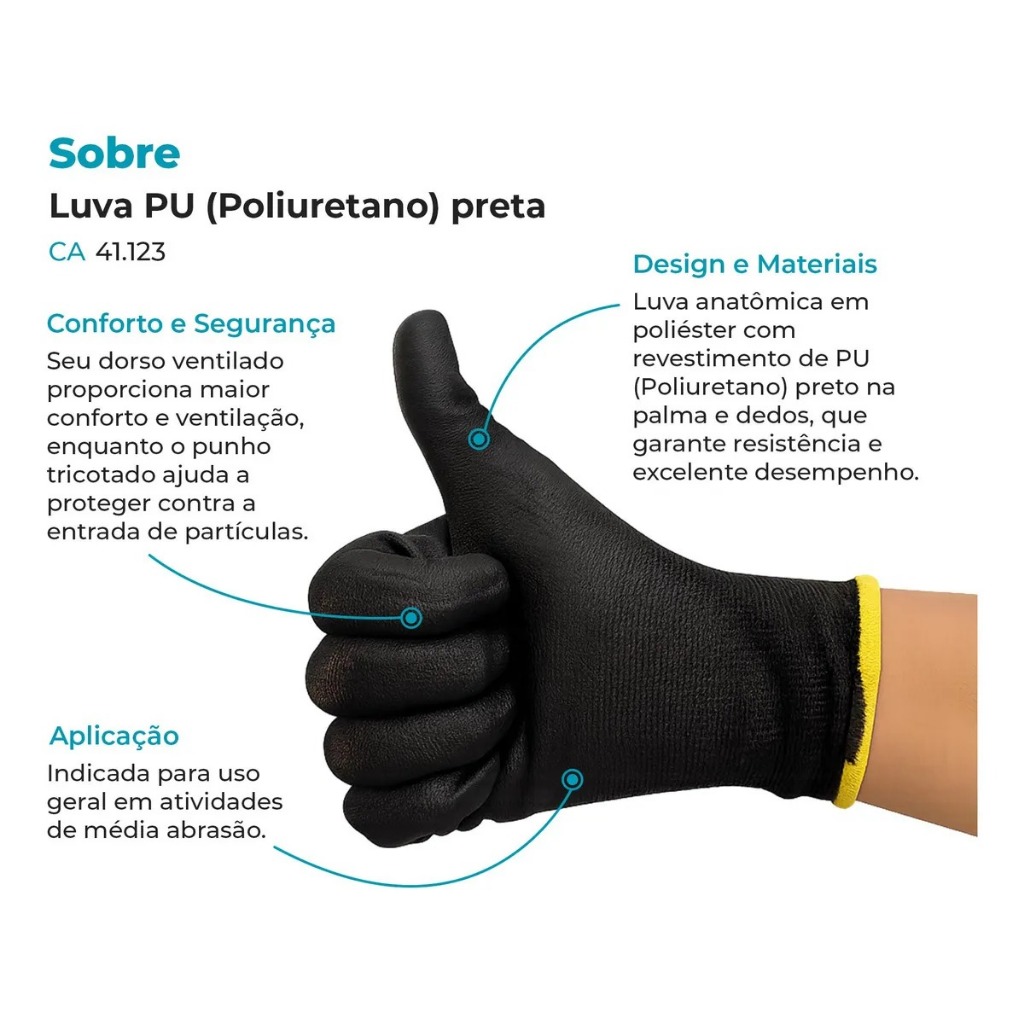 Luva PU Kit 24 pares Preta Luva Epi Segurança Multitato Mecânico Manutenção Serviços Gerais Antiestática
