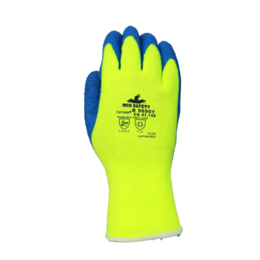 A Luva NXG® B9690Y FLEXTHERM é indicada para atividades que exigem proteção térmica, conforto e excelente aderência. Confeccionada em tecido tricotado com fio acrílico de alta visibilidade, mantém as mãos aquecidas mesmo em ambientes frios, ao mesmo tempo em que garante resistência ao calor de contato e à abrasão. Seu banho em látex azul oferece ótima aderência e maior segurança no manuseio de peças, ideal para trabalhos pesados. CARACTERÍSTICAS PRINCIPAIS - Proteção térmica: Resiste até 260°C (500°F) – Nível 4 ANSI para calor de contato - Proteção contra frio: Nível 1 EN511 para frio convectivo e de contato - Alta visibilidade com fio acrílico amarelo fluorescente - Revestimento antiderrapante em látex azul com textura rugosa - Alta resistência à abrasão - Conforto térmico sem perder a destreza manual - Modelo sem costura, com punho tricotado e reforço na palma ESPECIFICAÇÕES TÉCNICAS - Código: NXG® B9690Y - CA: 41.109 - Materiais: Algodão, Poliéster, Acrílico, Látex - Espessura: 7 Gauge - Palma: Látex rugoso - Dorso: Sem revestimento - Punho: Tricotado e elastizado - Comprimento médio: 28 cm - Sem forro interno - Cor: Amarelo limão (corpo) com azul (palma) SEGMENTOS ATENDIDOS - Construção civil - Indústria metal-mecânica - Setor automotivo - Mineração - Agropecuária - Indústria em geral