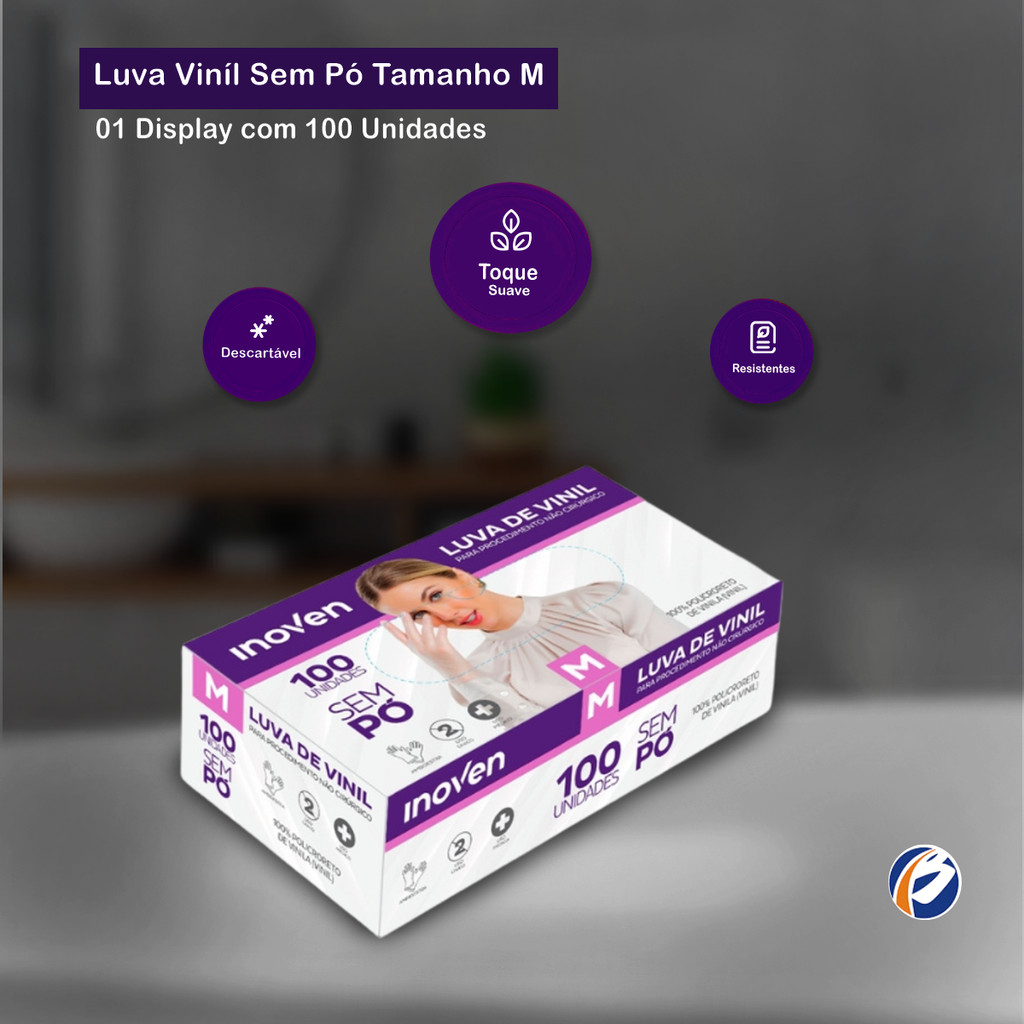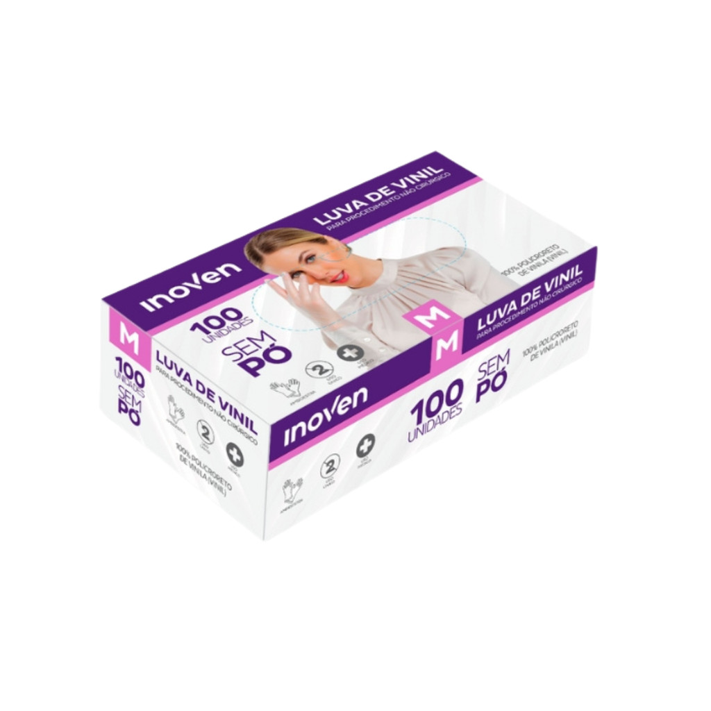 Luva Viníl sem Pó CA 46220 M com 100 unidades Inoven Luva para procedimento não cirúrgico fabricada em policloreto de vinila (vinil), sem pó, punho com virola, não estéril, ambidestra, hipoalergênica, descartável, uso único e Registro Anvisa. As luvas são anatômicas, ajustando-se perfeitamente às mãos, proporcionando um uso confortável por longos períodos. Indicações de Uso: - Ideal para áreas da saúde, estética, manipulação de alimentos e limpeza leve, oferecendo proteção higiênica e conforto sem pó. Cor: Transparente CA: 46220 Tamanho: M Embalagem: 01 display com 100 unidades