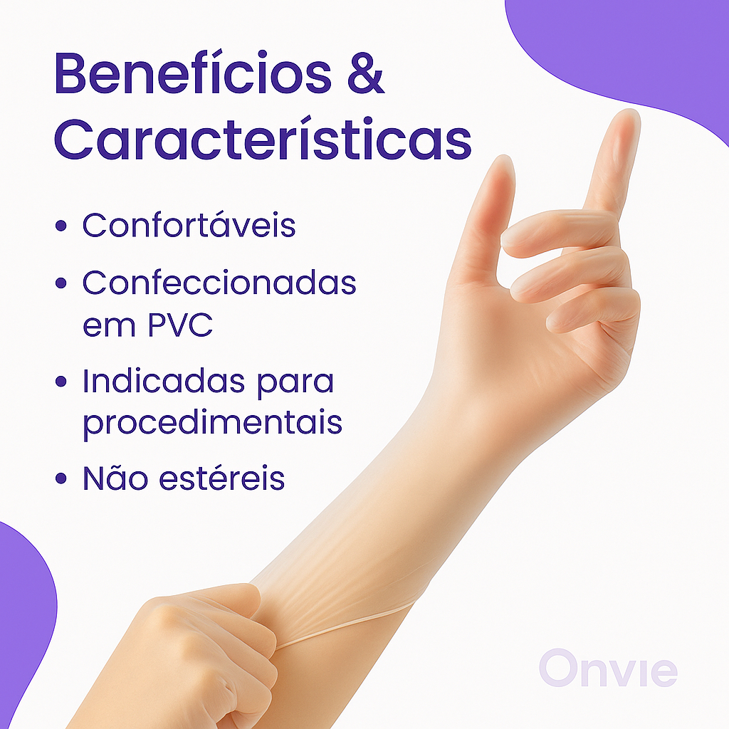 A luva de vinil sem pó é uma luva descartável utilizada em diversos segmentos, como na área da saúde, alimentícia e estética. Algumas características e informações técnicas sobre ela são: Composição: 100% de resina vinílica Cor: transparente Tamanhos disponíveis: P, M e G Livre de pó bioabsorvível Ambidestra Não estéril Resistência química e mecânica adequada para proteção contra agentes biológicos e químicos Possui Certificação do Inmetro É importante destacar que, apesar de oferecer proteção contra alguns agentes, a luva de vinil não é indicada para todos os tipos de procedimentos e pode apresentar limitações em relação à resistência e durabilidade em comparação com outros materiais, como as luvas de látex e nitrila. É sempre recomendado seguir as normas e orientações específicas de cada atividade para garantir a segurança adequada. *** A MARCAR VAI DE ACORDO COM A DISPONIBILIDADE EM ESTOQUE***