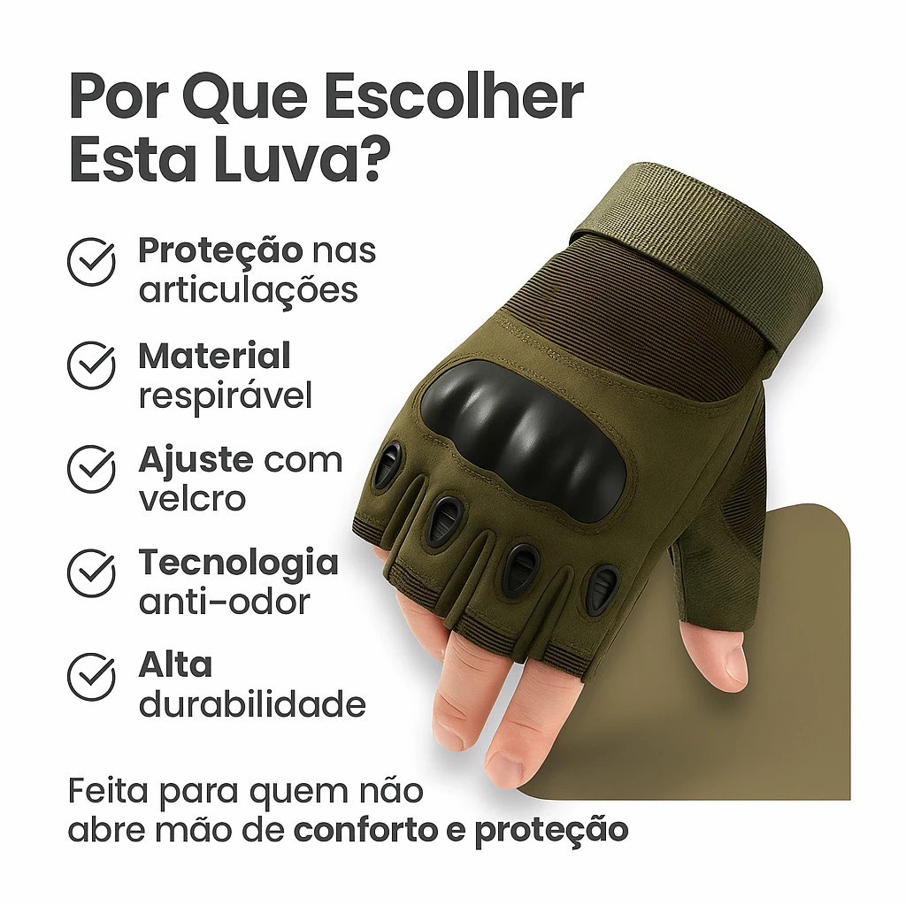🧤 Luvas Táticas Meio Dedo com Proteção – Conforto, Ventilação e Controle Projetadas para quem precisa de proteção sem perder mobilidade, estas luvas de meio dedo combinam conforto, resistência e ventilação, ideais para uso diário e atividades ao ar livre. ✅ Principais Benefícios Proteção reforçada nos dedos: Placas protetoras ajudam a reduzir impactos e atritos durante o uso. Design respirável: Orifícios de ventilação mantêm as mãos secas e confortáveis por mais tempo. Alta aderência: Palma com material antiderrapante para melhor controle e segurança. Ajuste confortável: Tecido flexível com fechamento ajustável no pulso. Leves e práticas: Fácil de vestir e remover, sem limitar os movimentos. 📌 Indicações de Uso Indicadas para atividades como ciclismo, motociclismo, treino funcional, trilhas, camping e tarefas ao ar livre.