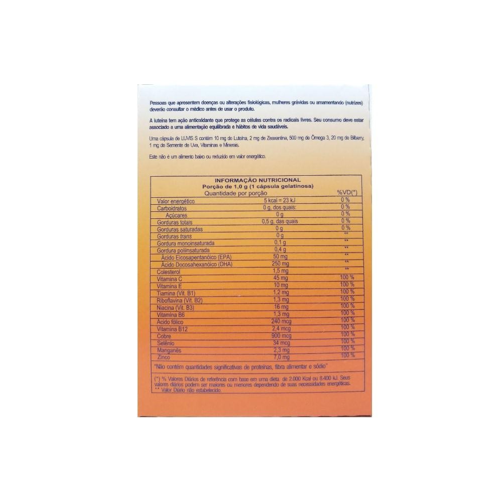 O Luvis é um suplemento vitamínico que auxilia na prevenção e redução do risco de progressão da Degeneração Macular Relacionada à Idade (DMRI), uma das principais causas da perda da visão após os 60 anos. Sua fórmula combina Luteína 10mg, Zeaxantina 2mg, Ômega 3, Bilberry, Semente de Uva, Vitaminas e Minerais, componentes essenciais que auxiliam no fortalecimento da saúde dos olhos, mantendo a visão saudável.
