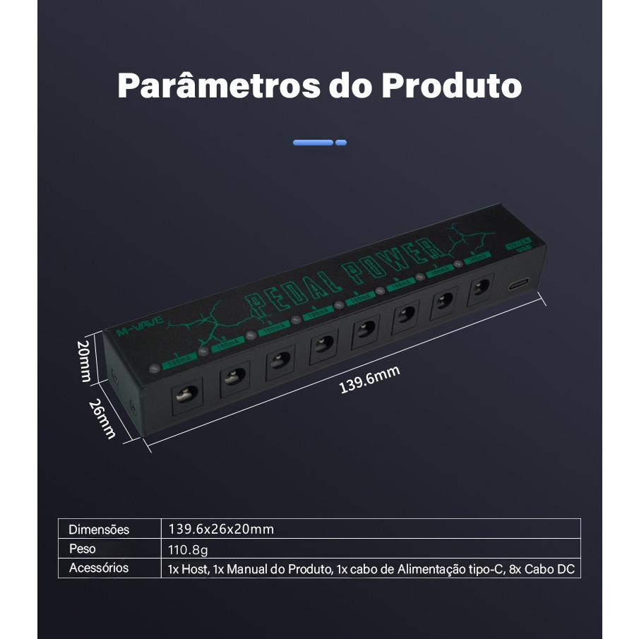 Características: 8 saídas de potência 9V independentes, inclui 6x9V 100mA, 2x9V 300mA. Cada luz LED indica o status de um canal, a luz LED correspondente apagará quando o canal sobrecorrente. Cada canal tem a função independente da proteção da sobrecarga, e a falha de um canal não afeta outros canais. Potência: 6 canais DC 9V 100mA, 2 canais DC 9V 300mA. Pode fornecer uma potência estável e de baixo ruído para o seu equipamento. Tamanho compacto e mini, muito útil para uma pequena placa pedal com um par de efeitos. Especificações: Materiais: Metal Entrada de energia: Tipo C 5V 2A Tamanho do item: 139,6*26*20mm/5,50*1,02 * 0,79in Peso do Item: 111g / 3.91oz Peso do pacote: 241g / 8.52oz Tamanho do pacote: 15.5*6*5.5cm / 6.10*2.36 * 2.17in Lista do pacote 1 * poder do pedal 1 * cabo tipo C 8 * Cabo DC 1 * Manual (Português)