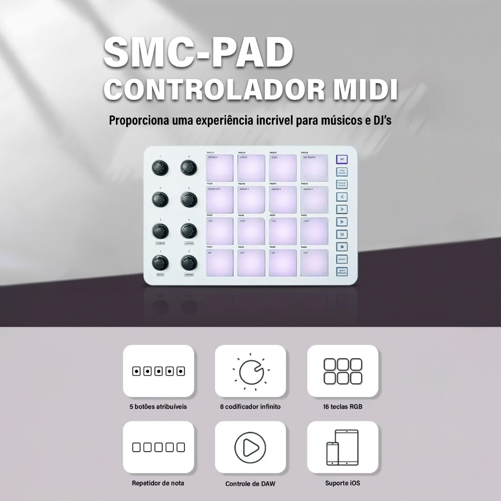 Controlador MIDI equipado com funcionalidade sem fio para produção musicalO design operado por bateria garante a criação contínua de música a qualquer hora e em qualquer lugarCompatível com a maioria das DAWs populares para uma integração perfeitaBotões de silicone retroiluminados projetados para uma resposta silenciosa e tátilOito grupos de codificadores rotativos de 360 graus, totalmente atribuíveis para ajustes detalhadosDezesseis pads RGB retroiluminados com sensibilidade à velocidade e aftertouchPossui porta de saída MIDI de 3 5 mm, permitindo conexões diretas com equipamentos externosFunção de repetição de notas, que dá mais profundidade aos padrões rítmicos e à dinâmica do desempenho