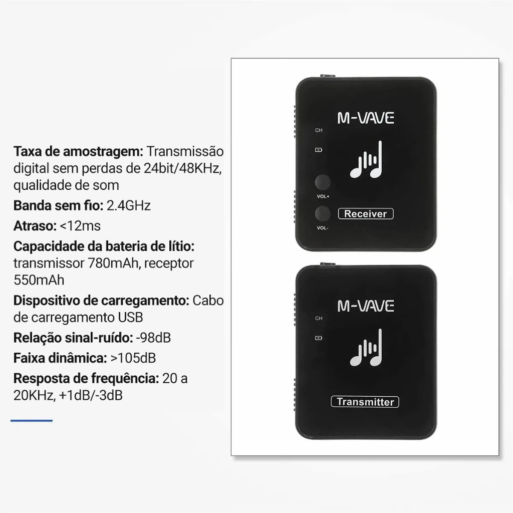 Monitor de auscultadores sem fios de tamanho mais pequeno e mais leve. Tecnologia sem fios 2.4G, baixo atraso, sem compressão. Bateria de lítio recarregável incorporada, 5 longas horas de trabalho, e inclui um cabo USB para um recarregamento cómodo. Ligue o transmissor a um telemóvel ou instrumento musical para utilização e ligue o recetor a auscultadores ou altifalantes para utilização. Suporta um transmissor para enviar sinais a vários receptores. O método de emparelhamento consiste em ligar vários receptores, premir demoradamente o botão de emparelhamento para entrar no modo de emparelhamento de intermitência rápida e, em seguida, ligar o transmissor, premir demoradamente para entrar no modo de emparelhamento, as luzes estão sempre acesas. Suporte para gravação no recetor, pode ligar o transmissor à entrada de linha, como instrumentos musicais, e depois ligar o recetor ao telemóvel para gravar. Suporta estéreo e mono.