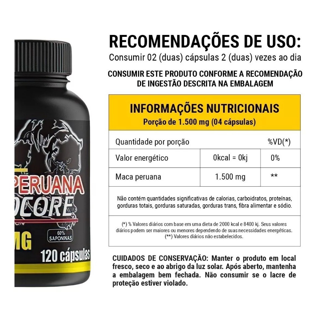 MACA PERUANA HARDCORE Não Contém Glúten / 100% Natural COMPOSIÇÃO: Maca Peruana, Vitamina E e Zinco. SUJESTÃO DE USO: Consumir 2 cápsulas 2x ao dia, ou critério médico / nutricionista. ADVERTÊNCIAS: Crianças, gestantes, idosos e portadores de qualquer enfermidade devem consultar o médico e/ou nutricionista. Qualquer dúvida, estamos a disposição. AGUARDAMOS O SEU PEDIDO