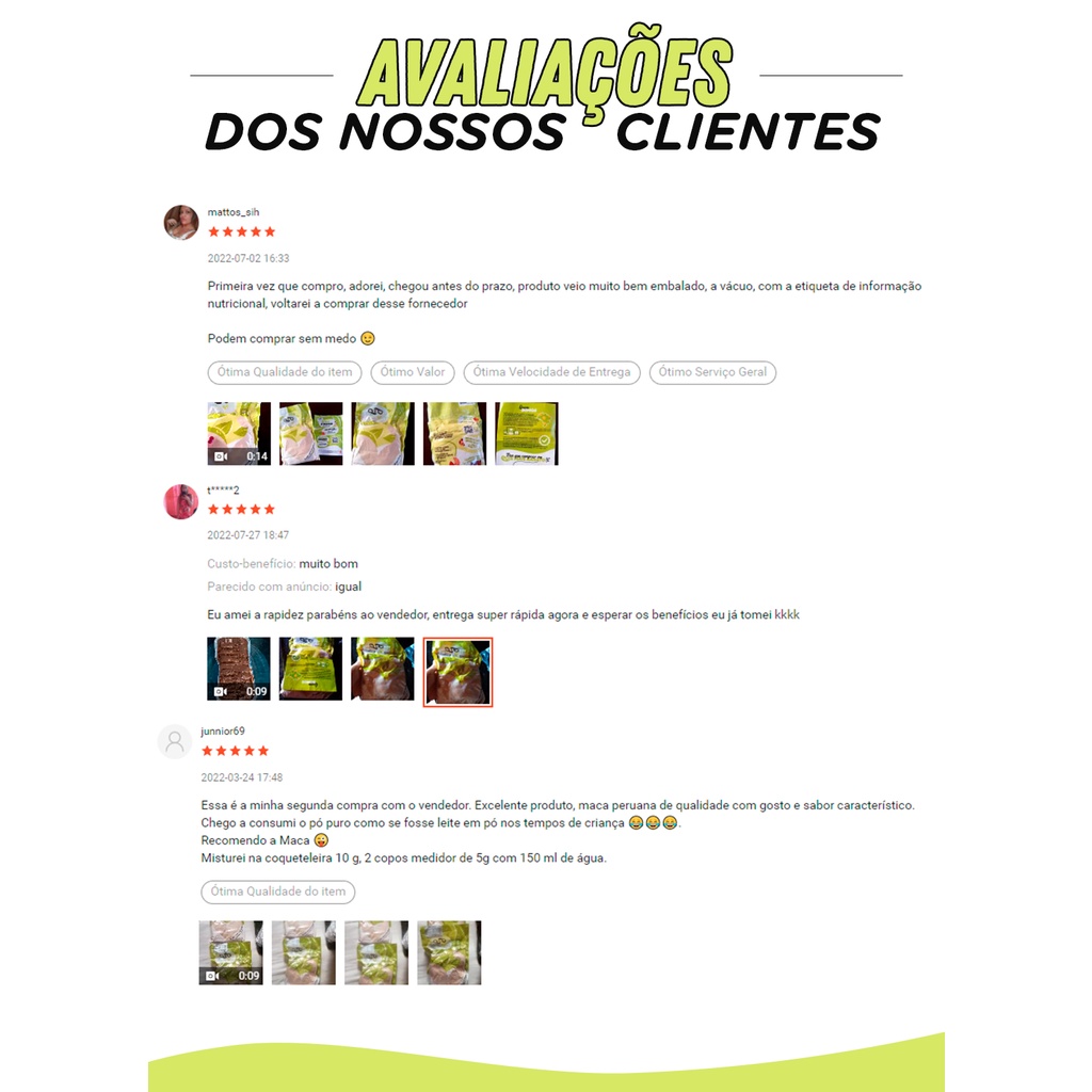 Descrição do produto: - Safra Nova (Produto produzido semanalmente, sempre fresco) - Enviada em Pacote de 500g - Maca Peruana da melhor Qualidade. A Maca Peruana é proveniente do Peru, como o nome indica. Ela é uma planta semelhante ao rabanete, e tem na raiz sua principal fonte de consumo e nutrientes. O fato desse vegetal nascer espontaneamente há mais de 4 mil metros de altitude, resistindo bravamente às mudanças climáticas, mostra bem toda a “força” desse tubérculo. O alimento pode ser incluído em sucos, shakes, sopas, entre outros. No caso dos sucos, o interessante é usá-lo com frutas cítricas, pois elas potencializam os seus efeitos nutricionais DÚVIDAS DE SEMPRE: 1) Em quando tempo meu pedido será enviado? ENVIAMOS O SEU PRODUTO EM ATÉ 24 HORAS APÓS A APROVAÇÃO DO PAGAMENTO. SE O PAGAMENTO FOR CARTÃO É MAIS RAPIDO. SE FOR BOLETO, AS VEZES DEMORA ATÉ 48HS, PARA OCORRER A IDENTIFICAÇÃO. 2) E se meu produto não chegar? TODOS OS PACOTES SEGUEM COM O PROTOCOLO DE RASTREIO, E VOCÊ PODE CONSULTAR DIARIAMENTE NO SITE DOS CORREIOS, PARA VER ONDE ELE ESTA. CASO OCORRA ALGUM SINISTRO, A MERCADORIA ESTÁ ASSEGURADA PELO SISTEMA SHOPEE, E VOCE RECEBE SEU DINHEIRO DE VOLTA. 3) Tem o produto disponível? SIM, TODOS OS PRODUTOS ANUNCIADOS ESTÃO DISPONIVEIS PARA COMPRA. 4) Qual a validade? VOCÊ IRÁ ENCONTRAR A VALIDADE ASSIM COMO O NÚMERO DO LOTE NA PARTE SUPERIOR DA EMBALAGEM. TRABALHAMOS APENAS COM PRODUTOS FRESCOS, DESSA FORMA VOCÊ RECEBERÁ O PRODUTO COM UMA VALIDADE EXTENSA. DEPENDENDO DO PRODUTO, DE ATÉ 2 ANOS. Ficou com alguma dúvida? Entre em contato com a gente!