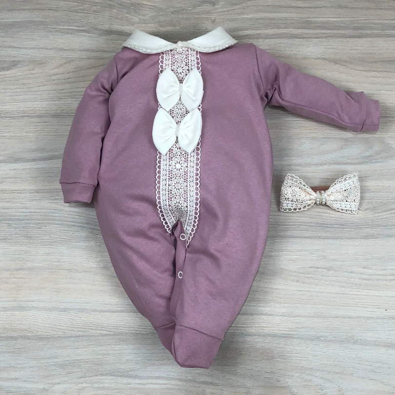 Macacão bebê menina com laço de renda e pérolas confortável Laura
