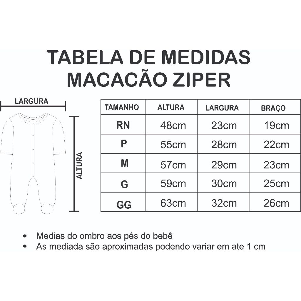 Macacão de malha com zíper para bebê, com zíper da gola até a perna do macacão, facilitando na hora de vestir o bebê, confeccionado em tecido macio e confortável, proporciona muito mais qualidade de sono ao bebê e o mantém protegido a noite toda , evitando resfriados e gripe! Modelinho ótimo para ser utilizado em todas as ocasiões e também como pijama! Tamanhos: RN 0-1 mês Medidas: 48 cm de comprimento X 23 cm de largura X 19 cm de braço Tamanho P 2-3 meses Medidas: 55 cm de comprimento X 28 cm de largura X 22cm de braço Tamanho M 4-8 meses Medidas: 57 cm de comprimento X 29 cm de largura X 23 cm de braço Tamanho G 8 a 11 meses Medidas: 59 cm de comprimento X 30 cm de largura X 25 cm de braço Composição: Produto confeccionado em malha 100% Algodão Antialérgica Por ser um produto confeccionado de forma artesanal, as medidas podem variar até 2 cm para mais ou para menos ( variação pequena , que não atrapalha a usabilidade e não interfere no tamanho final da peça) Dica de lavagem: - Lavar à mão, não deixar de molho, usar sabão neutro ou de coco e não usar alvejante. -Não misturar com peças coloridas. - Secar a Sombra COSTURANDO SONHOS