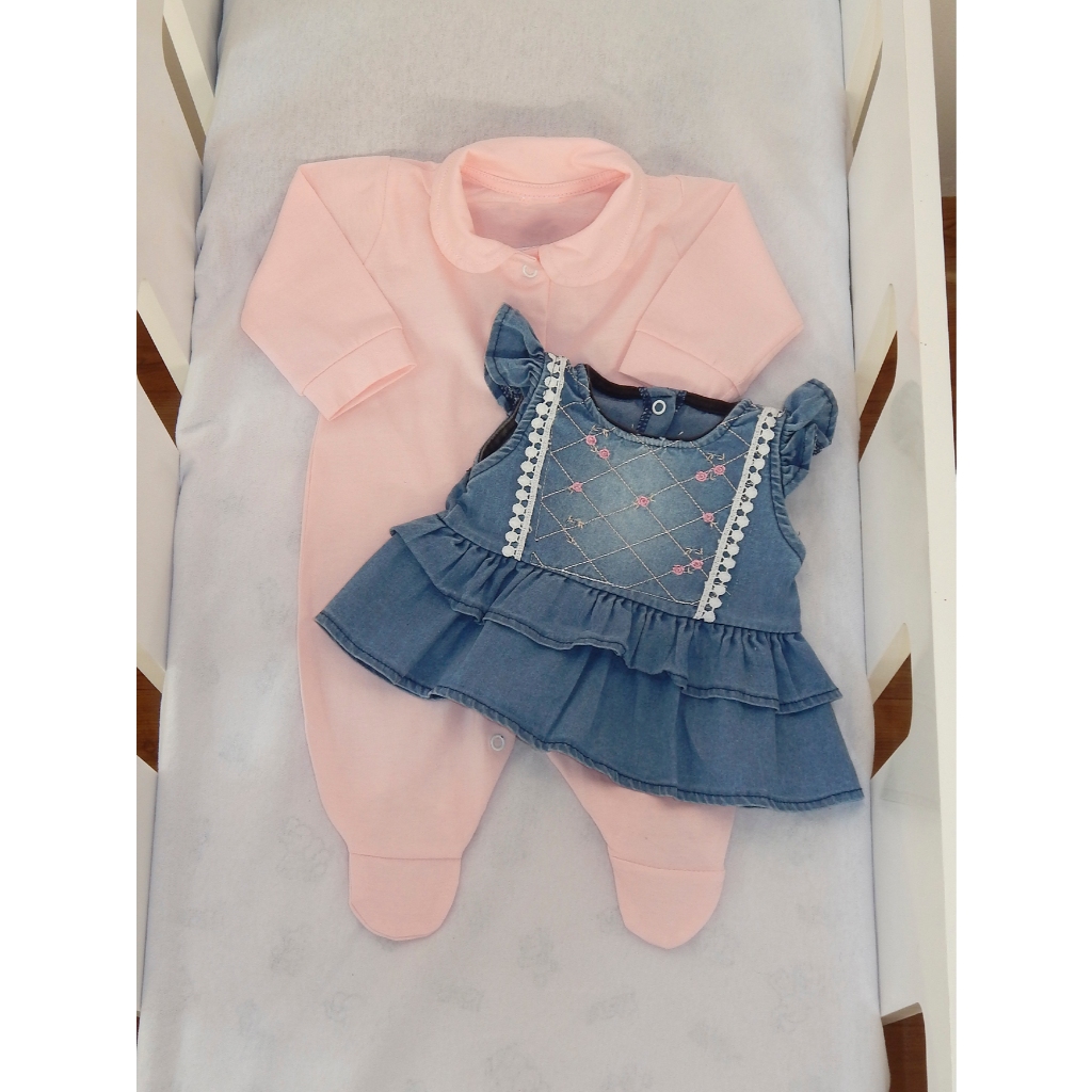 Macacão Bebê Vestido Jeans Bordado Kit Manu