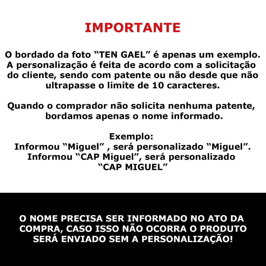 Lindo macacão camuflado personalizado com o nome do seu bebê em um sutache militar. ------------------------------- PERSONALIZAÇÃO ------------------------------- - Por ser roupa de bebê o sutache é pequeno, para melhor nitidez no bordado recomendamos até 10 caracteres. No caso de nome composto que ultrapasse 10 caracteres é necessário abreviar. - A personalização é feita de acordo com a solicitação do cliente, sendo com patente ou não, desde que não ultrapasse o limite de 10 caracteres. (Ex. Informou "MIGUEL", será personalizado "MIGUEL". Informou "CAP MIGUEL", será personalizado "CAP MIGUEL") * IMPORTANTE: O nome do bebê deve ser informado no momento da compra! Caso isso não ocorra, o macacão será enviado sem nenhuma personalização. ---------------------------------------------------------------------------------------------- Marca: Oncinha Bebê Composição: Meia Malha 100% Algodão Tamanhos: RN: (00 à 01 mês) P: (02 à 03 meses) M: (03 à 06 meses) G: (06 à 09 meses) Medidas (do ombro à ponta do pé) RN: Comprimento 50cm x Largura 26cm P: Comprimento 54cm x Largura 27cm M: Comprimento 59cm x Largura 31cm G: Comprimento 63cm x Largura 31cm Observação: Nos reservamos o direito de não aceitar troca ou devolução de produtos personalizados, tendo em vista que o mesmo não poderá ser enviado para outro cliente (Código do Consumidor).