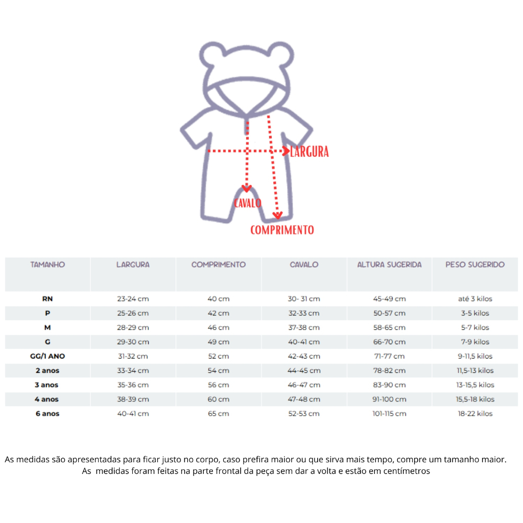 Macacão na cor laranja com estampa branca e preta, capuz e orelhas com enchimento. Possui botões de pressão na gola e entrepernas. Ideal para todas as ocasiões Perfeito para festas, aniversários ou até um dia divertido no parque. Não perca a chance de adicionar um toque mágico ao guarda-roupa do seu pequeno. Adicione ao seu carrinho agora mesmo! RECOMENDAÇÕES DE COMPRA Ao comprar, verifique sempre a tabela de medidas ou caso tenha dúvidas, entre em contato conosco. A tabela de medidas é sugerida para ficar justa no corpo (nem folgado, nem apertado). Então, caso prefira que fique mais folgadinho, recomendamos que compre no tamanho maior que o informado. RECOMENDAÇÕES DE LAVAGEM Para maior durabilidade, lave a mão e use sabão neutro. Alguns tipos de sabão podem soltar a tinta do tecido na água, principalmente os líquidos. Recomendamos que faça o teste antes. As cores do tecido podem sofrer leves alterações para mais claro ou escuro mediante lote do fornecedores NÃO PASSE o ferro sobre a estampa, pois contém insumos de poliuretano (emborrachados). Passar sempre no avesso.