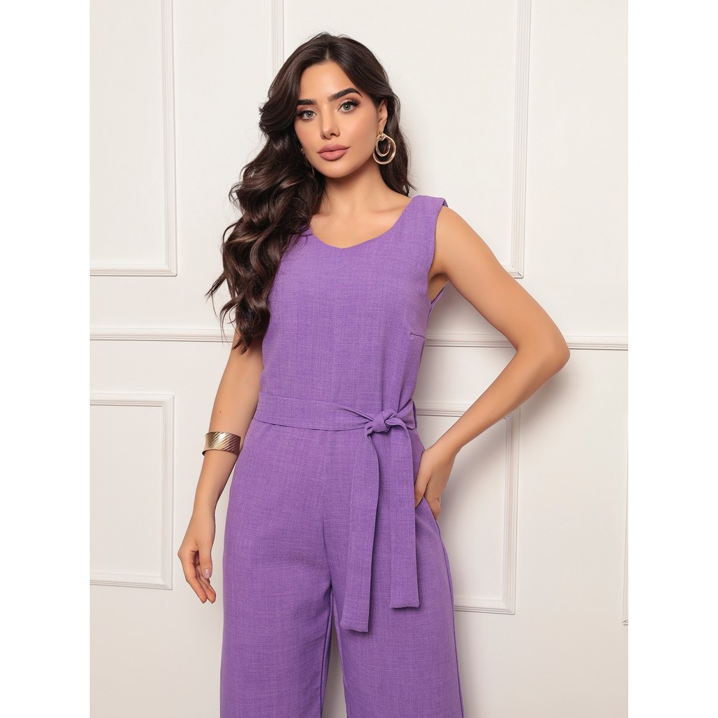 Macacão Feminino Linho Mocha Mousse Telho - Sem Mangas, Amarração na Cintura, Modelagem Solta e Confortável Elegante