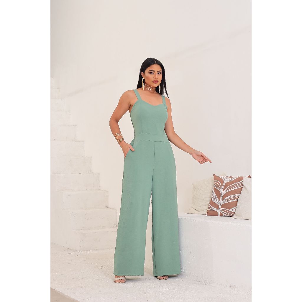 Macacão Feminino Longo com Bolso Lateral Lastex nas Costas Alça Grossa Elegante