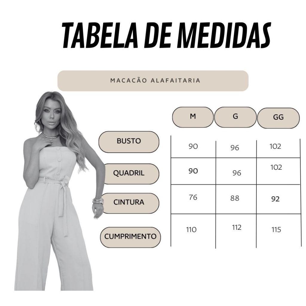 Eleve o seu estilo com o Macacão Feminino Alfaiataria Tomara Que Caia, uma escolha perfeita para quem busca elegância e modernidade. ✨ Destaques do Produto: Design de Alfaiataria: Com um corte impecável, o macacão oferece um caimento elegante que valoriza a silhueta,contendo bojo e ziper nas costase e ideal para ocasiões que pedem um toque de sofisticação. Tomara Que Caia: O decote tomara que caia confere um ar de modernidade e sensualidade na medida certa, destacando o colo e os ombros. Tecido de Alta Qualidade: Confeccionado em material nobre que proporciona conforto e durabilidade, mantendo você estilosa e segura durante todo o evento. Versatilidade: Perfeito para jantares, festas, eventos formais ou até mesmo um encontro especial, o macacão é uma peça única que dispensa grandes produções. Por que você vai se apaixonar: Elegância Atemporal: O design clássico e minimalista do macacão o torna uma peça versátil e atemporal, que pode ser usada em diversas ocasiões. Facilidade de Combinação: Combine com acessórios sofisticados, como um colar ou brincos longos, para um look ainda mais impactante. Conforto e Estilo: Sinta-se confortável e confiante ao usar uma peça que une o melhor da moda e da alfaiataria. Transforme qualquer ocasião em um momento especial com o Macacão Feminino Alfaiataria Tomara Que Caia. Adicione ao seu guarda-roupa e esteja sempre preparada para arrasar! Detalhes: Com cinto Gola: Sem alça Estilo: elegante Linha da cintura: Cintura Alta Estampa: Simples Tipo: Macacão Comprimento da Manga: Sem Mangas Comprimento: Longo Caimento da peça: Ajuste Regular Tamanhos Veste Busto Cintura Quadril Cumprimento M 38 a 40 90 76 90 110 G 40 a 42 96 88 96 112 GG 42 a 44 102 92 102 115