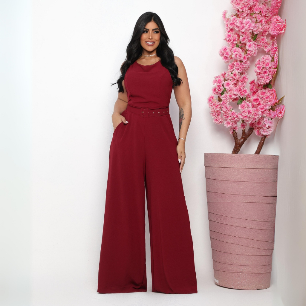 Macacão Feminino Social Elegante Festa Regata Pantalona Longo Cinto Alfaiataria Tecido Duna