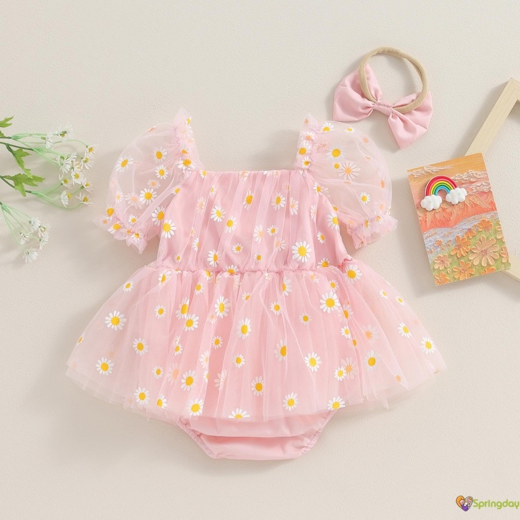 Macacão Infantil Bebê para Meninas Manga Curta Bufante Estampa de Margaridas com Faixa para Cabeça,0-18 Meses