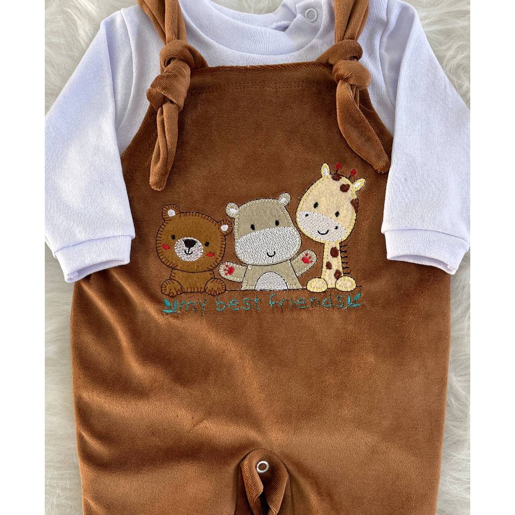 Macacão Jardineira Plush Manga Longa Unissex - Lia Baby Kids Cor: Jardineira Marrom com body branco, conforme fotos no anúncio!!! Obs. Nas avaliações podem ter modelos antigos, que vendemos tempos atrás. Macacão Jardineira Bebê com Body Confeccionado em tecido macio e confortável, ideal para o dia a dia do bebê. Possui bordado delicado de bichinhos e botões entre as pernas, facilitando a troca de fraldas. Acompanha body branco de manga longa. ✔ Confortável e quentinho ✔ Fácil de vestir ✔ Ideal para passeios e fotos 📦 Pronta entrega, feito no Brasil Tecido plush 100% poliéster ideal para seu bebê usar em dias de temperaturas mais baixas. O plush é bem quentinho, macio, suave ao toque e super confortável para nossos pequenos. O body é de suedine 100% algodão, excelente tecido também. Lavável na máquina. Cores conforme fotos no anúncio!!! (nas avaliações podem ter modelos que vendemos tempos atrás) Tamanhos disponíveis: RN -P - M - G Medidas aproximadas no comprimento (ombro ao pezinho): RN - 44 cm (recomendado de 0 a 2 meses) P - 46 cm (recomendado de 1 a 3 meses) M - 50 cm (recomendado de 3 a 5 meses) G - 53 cm (recomendado de 6 a 9 meses) Mas tudo varia muito de acordo com o tamanho do(a) bebê. Qualidade e Satisfação Garantida!!! Qualquer dúvida pode perguntar, ficamos a disposição... Lia Baby Kids ^^