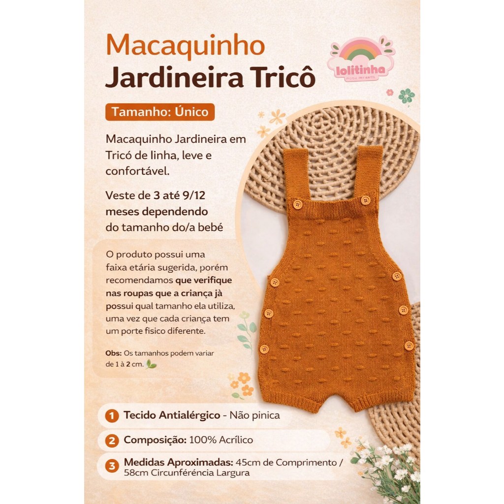 Macaquinho Jardineira Tricô Tamanho: Único Macaquinho Jardineira em Tricô de linha, leve e confortável. Veste até 9/12 meses dependendo do tamanho do/a bebê O produto tem sua faixa etária sugerida, porém recomendamos que verifique nas roupas que a crianças já possuem qual tamanho que elas usam, uma vez que cada criança tem seu porte físico diferente. Obs: Os tamanhos podem variar de 1 à 2 cm. Tecido Antialérgico - Não pinica Composição: 100% Acrílico Medidas Aproximadas: 45cm de Comprimento / 58cm Circunferência Largura Sabemos como essa fase é importante para você! E por isso fazemos tudo com muito carinho e cuidado Em caso de dúvida fique a vontade para chamar nós via Chat