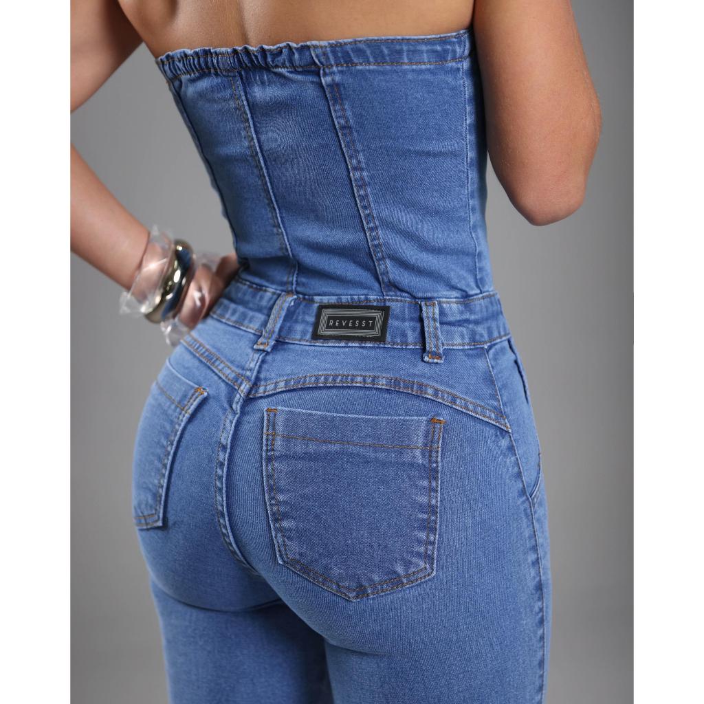 Macacão Jeans Feminino Skinny Longo, Cintura Alta Com Lycra, Tomara Que Caia, Revesst Jeans.