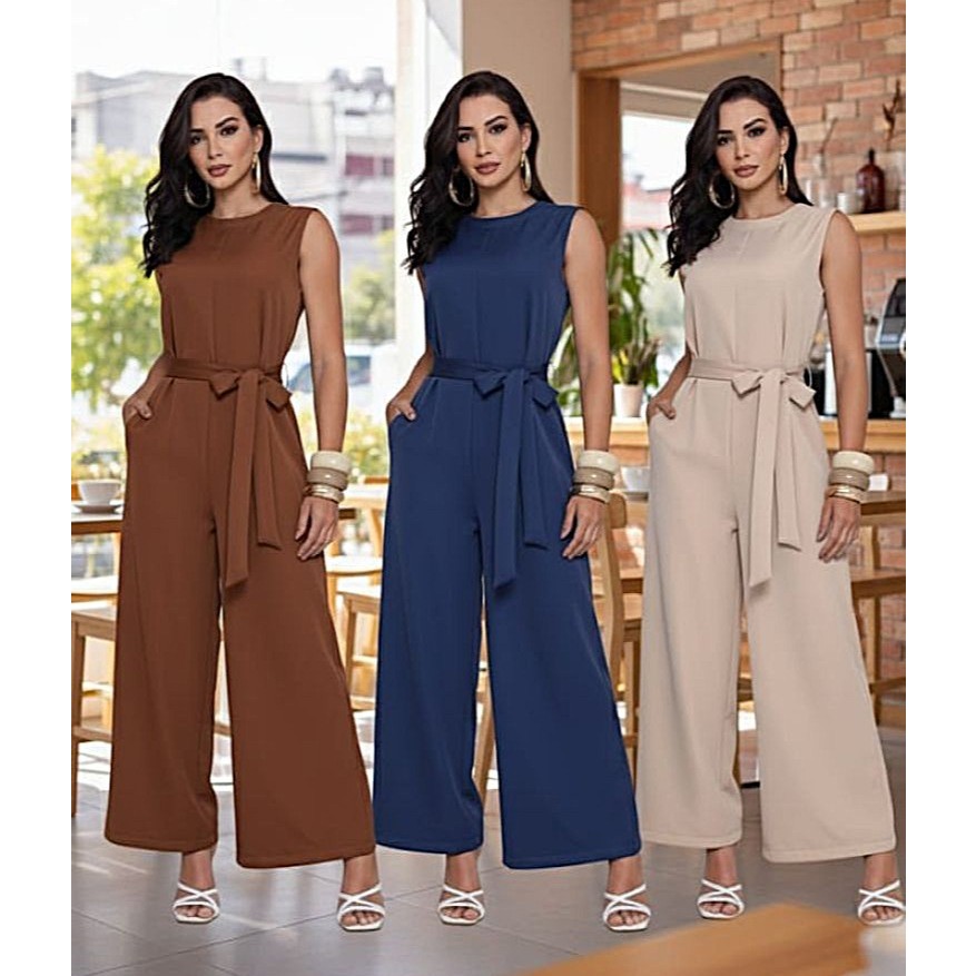 Macacão longo Feminino Pantalona con faixa Social Elegante