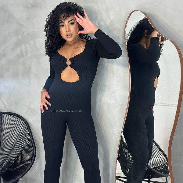 Macacão Manga Longa Argola Com Fenda Canelado Feminina