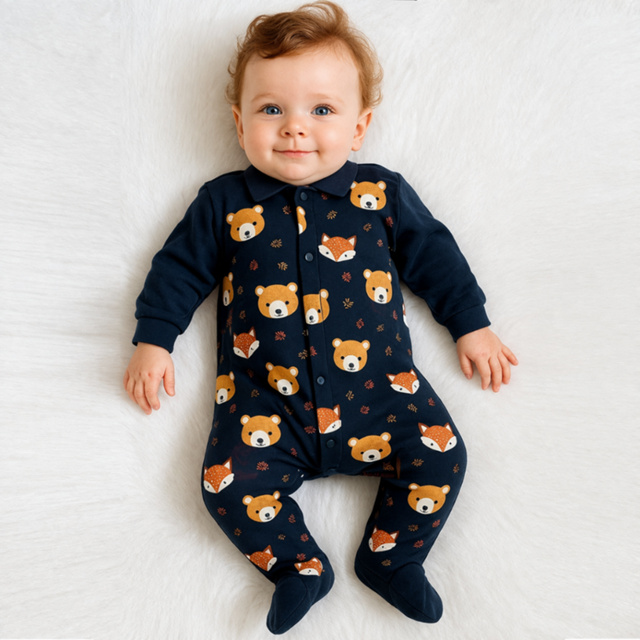 Macacão Manga Longa Vira Pé Bebê Menino – Estampa Ursinho e Raposa RN a 03 Meses
