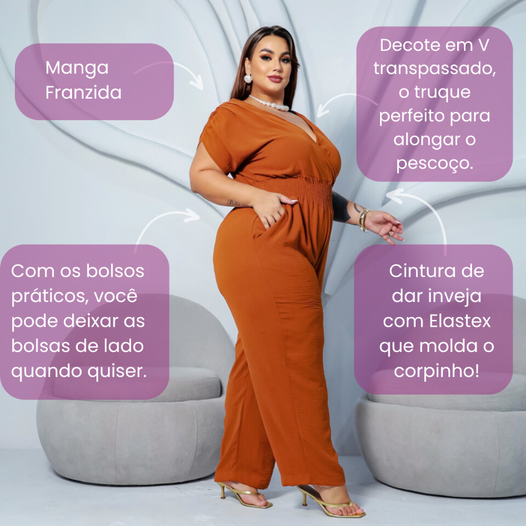 Macacão Pantalona Lastex na Cintura que Modela Plus Size Transpassado Decote V Confortável Lia Rosa