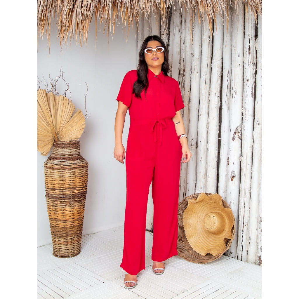 Macacão Plus Size Longo Feminino Liso com Elástico na Cintura Colarinho e Botões Linho com Viscose