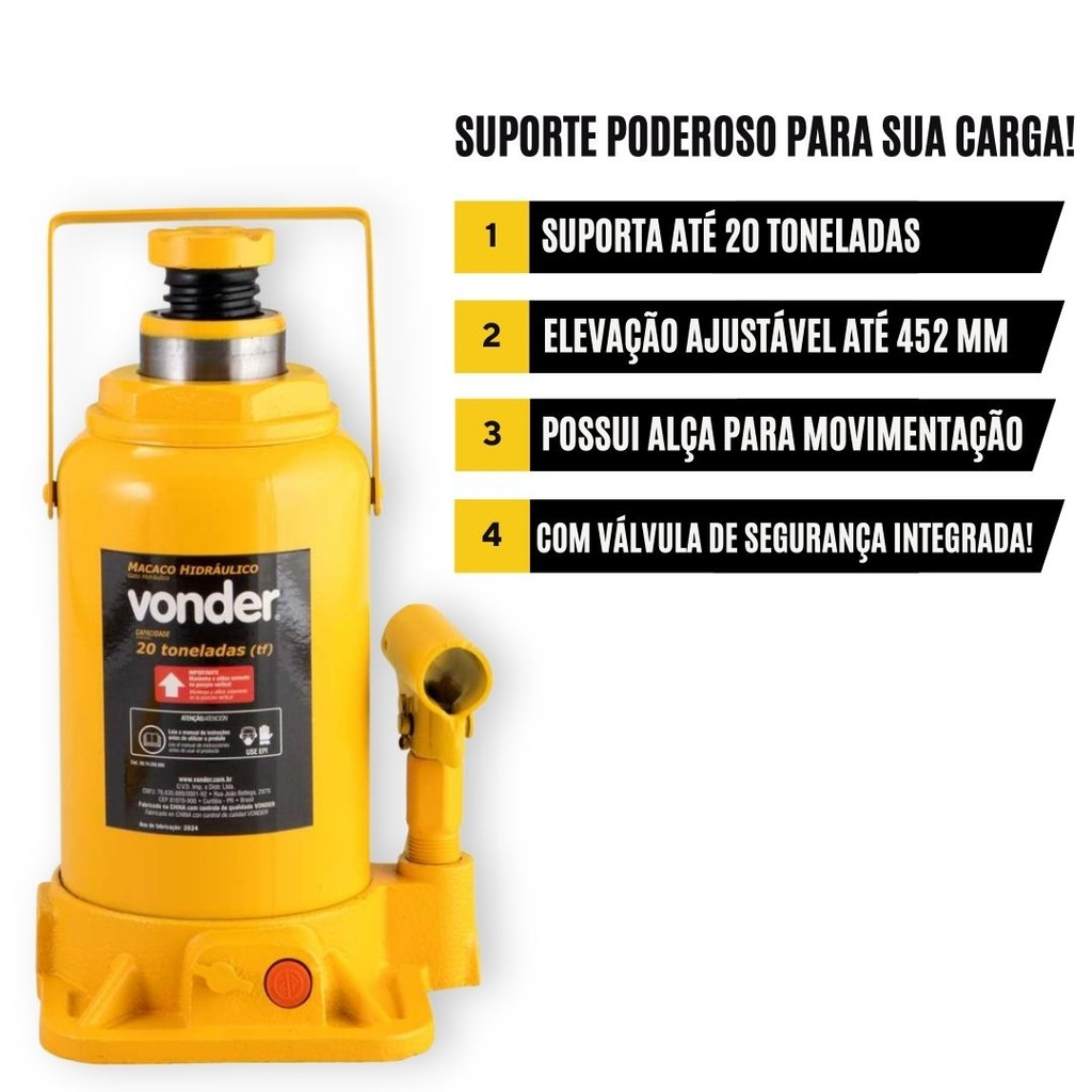 ***PRODUTO A PRONTO ENTREGA COM ENVIO IMEDIATO*** ITEM ORIGINAL COM NOTA FISCAL Somos a Domus, Loja oficial da Shopee. Temos 5 anos de experiência em E-Commerce e nosso maior objetivo é garantir a satisfação dos nossos clientes! Macaco Hidráulico Tipo Garrafa 20 Toneladas Vonder O Macaco Hidráulico Tipo Garrafa Vonder é a solução robusta e confiável para elevação de veículos ou cargas pesadas de até 20 toneladas. Ideal para aplicações industriais e profissionais, oferece segurança, praticidade e alta durabilidade. Equipado com válvula de segurança e fuso ajustável, garante precisão e eficiência durante o uso. Características Técnicas: Capacidade de Carga: 20 toneladas Altura Mínima: 242 mm. Altura Máxima: 452 mm. Curso do Pistão: 150 mm. Curso do Fuso: 60 mm. Número de Estágios: 1 estágio hidráulico + fuso de ajuste. Dimensões da Base: 155 mm x 160 mm. Quantidade de Óleo Hidráulico: 600 ml. Diferenciais: Válvula de Segurança: Evita elevação superior à capacidade máxima, proporcionando maior segurança. Fuso de Elevação com Rosca: Ajuste preciso e maior alcance de elevação. Design Prático: Cabo dividido em 2 partes para facilitar o armazenamento e alça integrada para manuseio. Construção Robusta: Ideal para suportar cargas pesadas com estabilidade e confiabilidade. Atenção: Use, transporte e armazene o macaco somente na posição vertical para evitar vazamento de óleo. Nunca permaneça sob veículos elevados apenas pelo macaco hidráulico. Sempre utilize cavaletes de apoio para garantir a segurança. Benefícios: Elevação potente e confiável para cargas pesadas. Fácil ajuste e manuseio. Compacto e fácil de armazenar. Garantia de 90 dias + garantia contratual de 3 meses. TORNE SUAS OPERAÇÕES MAIS SEGURAS E EFICIENTES COM O MACACO HIDRÁULICO VONDER!