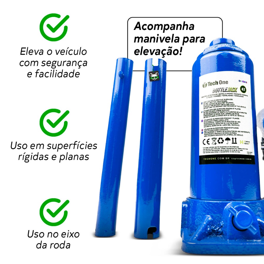 Macaco Hidráulico Garrafa 4T Portátil Tech One 4 Toneladas TROCA FÁCIL DE PNEUS E MANUTENÇÃO DO SEU AUTOMÓVEL Pensando em levar qualidade e segurança aos motoristas em momentos de sufoco, a Tech One apresenta o Macaco Hidráulico Garrafa 4T. SEGURO E EFICIENTE O produto é fabricado em ferro, o que o torna resistente e ideal para a troca de pneus e manutenção do seu veículo, permitindo que este seja elevado com segurança e facilidade. ** O modelo de 4 toneladas é indicado para SUVs, 4x4, pick-ups e caminhonetes. ORIENTAÇÕES - A utilização deve ser feita em uma superfície rígida e plana. - O macaco deve ser utilizado no eixo da roda ou na longarina. Não deve ser utilizado na lateral do veículo; a modificação das características originais do produto acarreta a perda da garantia. ESPECIFICAÇÕES TÉCNICAS: - Capacidade Suportada: 4T (Toneladas) - Fabricado em ferro - Resistente e de ótima qualidade - Ideal para troca de pneus e manutenção do seu automóvel - Permite elevar com segurança e facilidade - Acompanha manivela para elevação - Projetado para o uso em superfícies rígidas e planas - Projetado para o uso no eixo da roda - Altura mínima de levantamento: 180 (mm) - Altura máxima de levantamento: 340 (mm) CONTEÚDO DA EMBALAGEM: • 01. Macaco Hidráulico Garrafa 4 Toneladas • 01. Manivela para Elevação Recomendamos que a instalação seja feita por um profissional, não nos responsabilizamos pelo mal uso do produto.