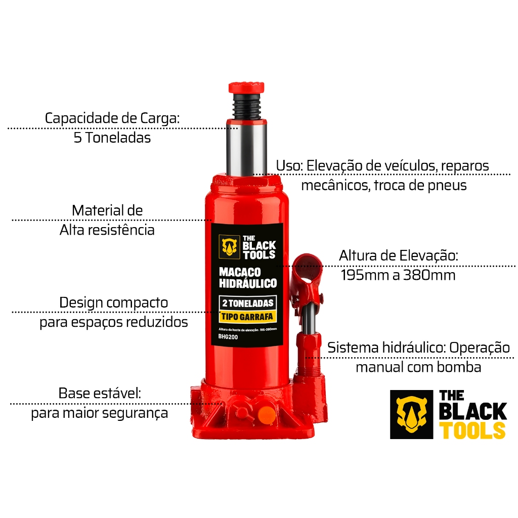 A The Black Tools é uma marca comprometida com a qualidade e as necessidades do cliente. Nosso objetivo é oferecer as melhores soluções para o seu dia a dia, com um design funcional e inovador. MACACO HIDRAULICO GARRAFA 2 TONELADAS 15CM A 28,50CM BHG200 - The Black Tools DESCRIÇÃO: O Macaco Hidráulico Manual Tipo Garrafa é preparado para elevar cargas com peso de até 2 toneladas, desenvolvido em material de alta qualidade e resistência. É uma ferramenta indispensável para elevação de cargas, veículos e outros equipamentos. VANTAGENS: - O macaco hidráulico tipo garrafa não foi projetado para cargas de apoio em longo prazo sobre o peso ou para movê-lo. - Antes da elevação, certificar-se de que a carga é distribuída uniformemente sobre a superfície do centro. - Altura suficiente para instalar um suporte rígido sob a carga elevada e reparos. - A carga levantada não deve exceder o peso especificado pelo fabricante. INDICADO PARA: - Uso em situações que exigem elevação segura e estável de cargas. - Levantamento de equipamentos pesados em oficinas e indústrias. - Elevação de veículos, como carros, motos e caminhonetes. - Reparos mecânicos e troca de pneus. FICHA TÉCNICA: - Capacidade de Carga: 2 Toneladas (2000 Kg) - Altura Máxima de Elevação: 285mm - Altura Mínima de Elevação: 150mm - Comprimento da Alavanca: 260mm MARCA: The Black Tools MODELO: BHG200 + KIT DE CHAVES JOGO CATRACA REVERSÍVEL SOQUETES 40 PEÇAS COM MALETA O Kit Jogo Soquete com catraca 40 peças, é uma ferramenta essencial para quem busca praticidade e eficiência em reparos e manutenções; Composto por 40 peças, incluindo soquetes de diversos tamanhos e uma catraca, é ideal para trabalhos em mecânica, elétrica e hidráulica. FICHA TÉCNICA: - Uso Doméstico; - Aço Carbono. ACOMPANHA: - 14 Soquetes 1/4" em milímetros: 4mm, 4,5mm, 5mm, 5,5mm, 6mm, 6,5mm, 7mm, 7,5mm, 8mm, 9mm, 10mm, 11mm, 12 e 13mm; - 14 Soquetes 1/4" em polegadas: 5/32", 3/16", 7/32", 1/4", 9/32", 5/16", 11/32", 3/8", 13/32", 7/16", 15/32", 1/2", 17/32", 9/16"; - 03 Soquetes 1/4" em polegadas (8pt): 1/4", 5/16", 3/8"; - 01 Catraca reversível 3/8"- comprimento: 17cm; - 02 Soquetes 3/8" em milímetros: 14mm, 15mm; - 01 Estojo para armazenamento; - 02 Soquetes 3/8: 5/8" , 11/16"; - 01 Adaptador 1/4" x 3/8"; - 01 Barra extensora 3"; - 01 Disco. SKU: KIT24584_23375