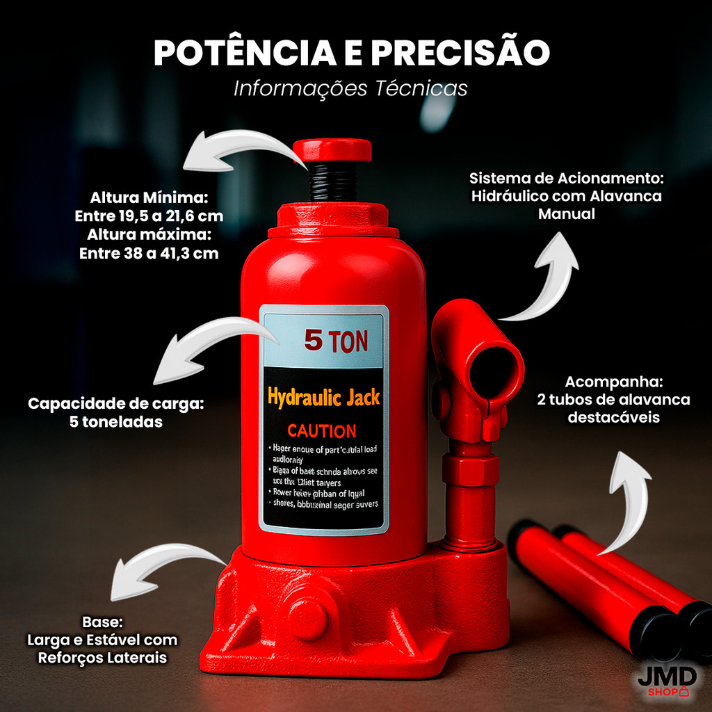Macaco Hidráulico Tipo Garrafa – Força, Segurança e Durabilidade em um Só Produto O Macaco Hidráulico Tipo Garrafa é a ferramenta essencial para quem busca força e estabilidade na hora de levantar veículos com segurança. Disponível nas versões 3, 4 e 5 toneladas, é ideal para carros, SUVs, caminhonetes e uso profissional em oficinas mecânicas. Construído em aço reforçado de alta resistência, o modelo tipo garrafa oferece potência de elevação com mínimo esforço, graças ao seu sistema hidráulico de alta pressão. DOR Trocar um pneu ou fazer manutenção sob o carro pode ser perigoso e cansativo quando se usa ferramentas fracas ou instáveis. SOLUÇÃO Com o Macaco Hidráulico Tipo Garrafa, você tem elevação rápida, estável e segura, sem esforço físico e sem risco de deslizamento. BENEFÍCIOS Suporta até 5 toneladas, ideal para diversos tipos de veículos. Sistema hidráulico de alta pressão, que levanta com facilidade e precisão. Estrutura em aço reforçado, garantindo durabilidade e resistência. Pistão cromado, que evita ferrugem e aumenta a vida útil do produto. Válvula de segurança, impedindo sobrecarga ou acidentes. Design compacto tipo garrafa, fácil de guardar e transportar. Base larga e estável, oferecendo mais segurança durante o uso. Alavanca de acionamento com empunhadura firme, para operação confortável. Perfeito para oficinas, borracharias e emergências na estrada.