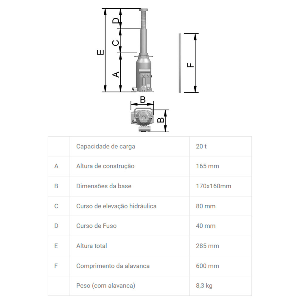 Macaco Hidráulico Tipo Garrafa MT 20 Toneladas com Alavanca Bovenau 21100 - MT20B Olá, seja bem-vindo à loja virtual da Cicampo Máquinas e Ferramentas, o seu shopping das ferramentas! O Macaco Hidráulico Tipo Garrafa MT 20 Toneladas com Alavanca - Bovenau é a solução ideal para quem busca força, resistência e eficiência em aplicações exigentes. Com capacidade para suportar até 12 toneladas, este modelo é uma evolução dos tradicionais macacos tipo garrafa, oferecendo desempenho aprimorado e construção robusta para enfrentar qualquer desafio. Projetado para atender às demandas de oficinas mecânicas, transportadoras, indústrias e usuários que precisam de um equipamento confiável, o modelo MT combina qualidade e robustez. Não comprometa a eficiência do seu trabalho, escolha o Macaco Hidráulico Bovenau MT 21100 e experimente a diferença! CódigoModelo: 21100 - MT20B Marca: Bovenau Especificações Técnicas Capacidade de Carga: 20 Toneladas Altura Máxima de Elevação: 285mm Altura Mínima de Elevação: 165mm Dimensões da Base: 170x 160mm Curso de Elevação Hidráulica: 80mm Curso do Fuso: 40mm Comprimento da Alavanca: 600mm Peso: 8.3Kg Itens Inclusos 01 -Macaco Hidráulico Tipo Garrafa MT 20 Toneladas com Alavanca Bovenau 21100 - MT20B Prazo de Garantia 12 meses conforme especificações do fabricante Imagens meramente ilustrativas Todas as informações divulgadas são de responsabilidade do fabricantefornecedor Os preços anunciados neste site podem sofrer alterações sem avisos prévios