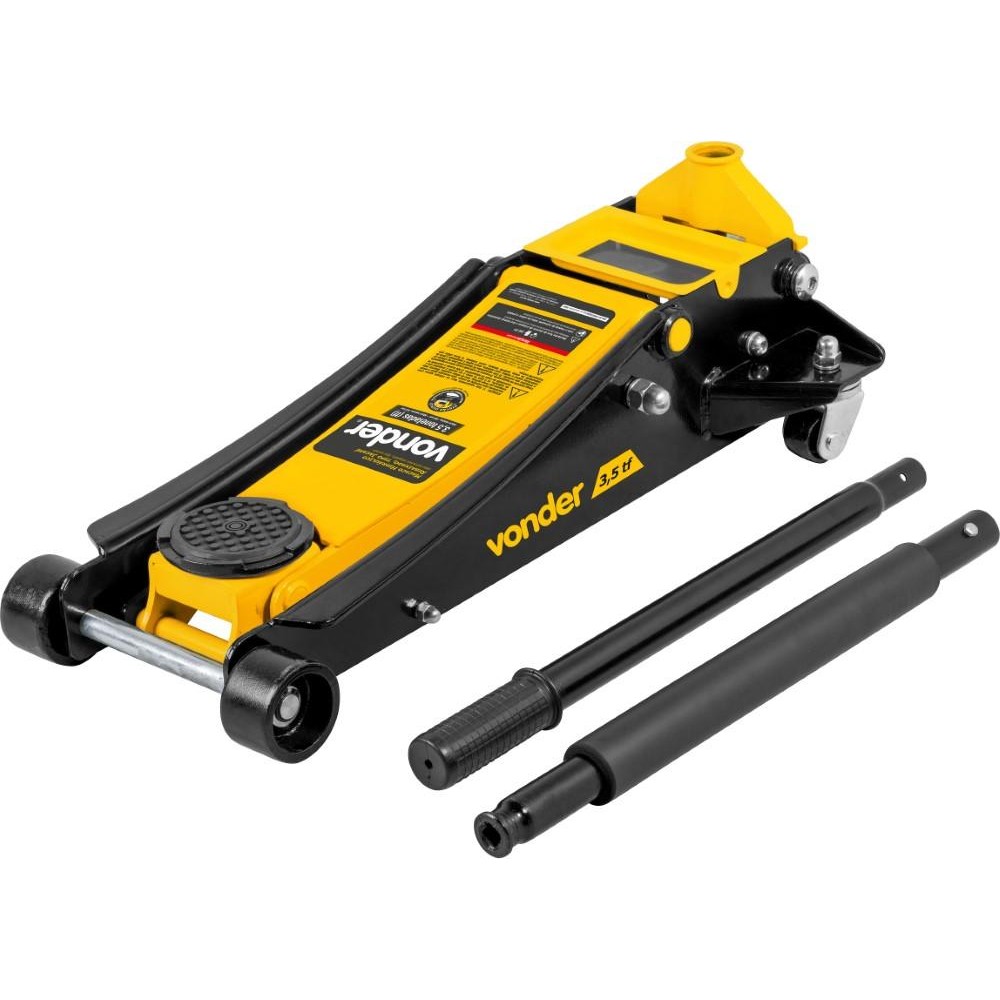 Marca: Vonder Código: 6874035000 Conteúdo da embalagem 1 Macaco hidráulico jacaré. Destaques e diferenciais: Possui pistão duplo que proporciona maior rapidez no acionamento (aproximadamente 9 acionamentos para curso completo - sem carga), corpo/chassis em chapa de aço com estrutura reforçada e válvula de segurança para evitar elevação superior à sua capacidade. Conta ainda com cabo bipartido removível e empunhadura ergonômica. Possui também rodas reforçadas e suporte de carga emborrachado, evitando danos ao veículo. Aplicações e dicas de uso: Indicado para elevar veículos ou cargas de acordo com sua capacidade. Exclusivo perfil baixo, ideal para veículos esportivos ou rebaixados. Atenção: o operador jamais deve ficar embaixo de um veículo elevado/suspenso por macaco hidráulico, sem o posicionamento de cavaletes de apoio. Risco iminente de acidente grave. Capacidade do macaco hidráulico tipo jacaré: 3,5 toneladas (3,5 tf) Altura mínima: 100 mm Altura máxima: 533 mm Altura da base traseira: 75 mm Diâmetro do suporte de elevação: Ø 110 mm Comprimento total: 741 mm Largura: 343 mm Material da roda: Ferro Massa aproximada (peso) (kg): 40 kg Garantia - E (CDC): Garantia legal: 90 dias