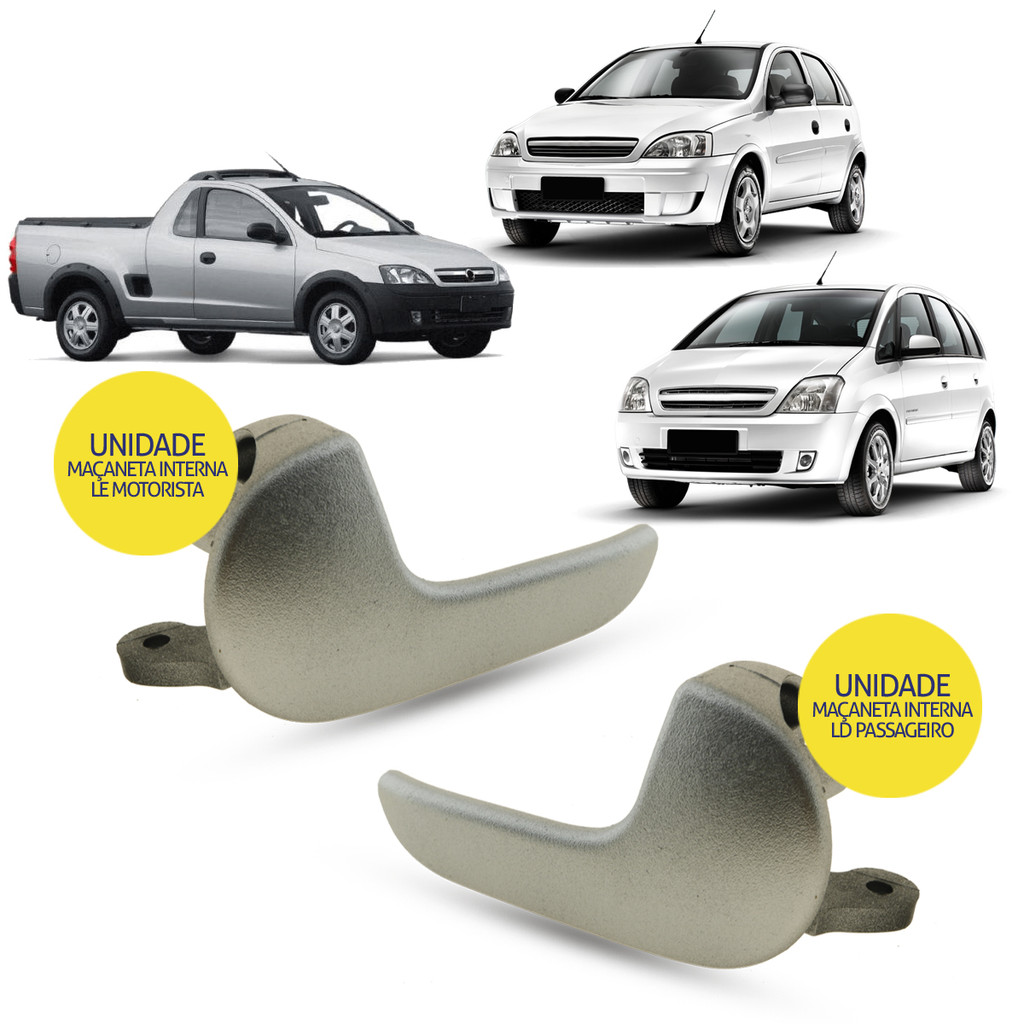 Maçaneta Interna Porta Dianteira Traseira - Prata COMPATÍVEL COM: Chevrolet Corsa 2002 até 2012 Chevrolet Meriva 2002 até 2012 Chevrolet Montana 2003 até 2010 CARACTERÍSTICAS: - Produto Novo. - Ótima Qualidade e Durabilidade. - Ideal Para Reposição. - Instalação Prática. PREÇO: - Unitário CONTEÚDO DA EMBALAGEM: - 1 Maçaneta NÚMEROS OEM COMPATÍVEIS: 13.104.272.G-PT - 13.104.271.G-PT LADOS DISPONÍVEIS: - Lado Esquerdo (Motorista) - Lado Direito (Passageiro) CORES DISPONÍVEIS: - Prata FRETE: - Consulte Acima do Botão Comprar Recomendamos que instalação seja feita por um profissional. NÃO NOS RESPONSABILIZAMOS PELA MÁ INSTALAÇÃO DO PRODUTO. TIRE SUAS DÚVIDAS NO CAMPO DAS PERGUNTAS. Equipe CLICKAR. Especialista em Acessórios Automotivos. ________________________________________________________________ As marcas e modelos mencionados neste anúncio são utilizados apenas como referência aos tipos de produtos, e não estão associados às marcas reais. Queremos ressaltar que não temos qualquer ligação direta com as marcas mencionadas e que as informações aqui apresentadas têm o propósito exclusivo de referenciar os devidos itens. Os produtos são genéricos/alternativos com qualidade e especificações dos produtos originais. Conforme artigo 31 da Lei: 8078 de 11.09.1990.