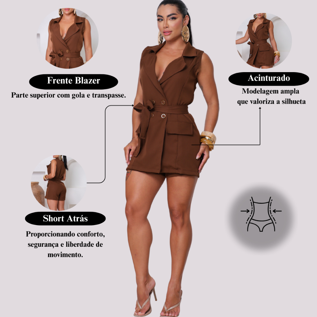 ✨ Macaquinho Blazer Feminino em Alfaiataria – Elegância que valoriza ✨ Esse macaquinho estilo blazer é a escolha perfeita para mulheres que buscam sofisticação, praticidade e um visual poderoso. Confeccionado em tecido de alfaiataria, possui ótimo caimento, acabamento refinado e estrutura que valoriza a silhueta. O modelo conta com short interno embutido, garantindo conforto e segurança ao vestir. O corte tipo blazer com transpasse traz um ar moderno e elegante, enquanto o cinto do próprio tecido define a cintura e realça o corpo de forma elegante. Os botões frontais são funcionais, permitindo ajuste no fechamento, e os bolsos são decorativos, mantendo o design alinhado e sofisticado da peça. Ideal para usar em ocasiões sociais, trabalho, eventos ou produções casual chic. 💼✨ Uma peça versátil que transita facilmente do look profissional ao fashion. 📏 Tabela de Medidas – Macaquinho 🔹 P (36–38) Cintura: 70 cm - Quadril: 90 cm - Busto: 90 cm - Comprimento: 81 cm 🔹 M (38–40) Cintura: 76 cm - Quadril: 96 cm - Busto: 96 cm - Comprimento: 83 cm 🔹 G (40–42) Cintura: 84 cm - Quadril: 104 cm - Busto: 104 cm - Comprimento: 85 cm 🔹 GG (42–44) Cintura: 90 cm - Quadril: 110 cm - Busto: 110 cm - Comprimento: 87 cm 📌 Dica importante: Use uma fita métrica e compare suas medidas com a tabela para escolher o tamanho ideal. O tecido não possui elastano. 💖 Aposte em um macaquinho elegante, moderno e cheio de personalidade. Garanta o seu e eleve seus looks com muito estilo!