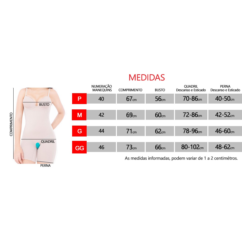 Body com compressão, comprime o estômago e a barriga, diminui a cintura e o culote e levanta o bumbum! Modela o corpo até as pernas, disfarçando as gordurinhas que incomodam mulheres de todas as idades. Tudo isso ao mesmo tempo em que permite total liberdade de movimentos. Com abertura entre as pernas para facilitar na hora da higienização. Com bojo estruturado e alças reguláveis. COMPOSIÇÃO 79% Poliamida 21% Elastano Forro 100% Algodão TAMANHOS DISPONÍVEIS P veste 40 M veste 42 G veste 44 GG veste 46 DUVIDAS? UTILIZE O CAMPO DE PERGUNTAS.