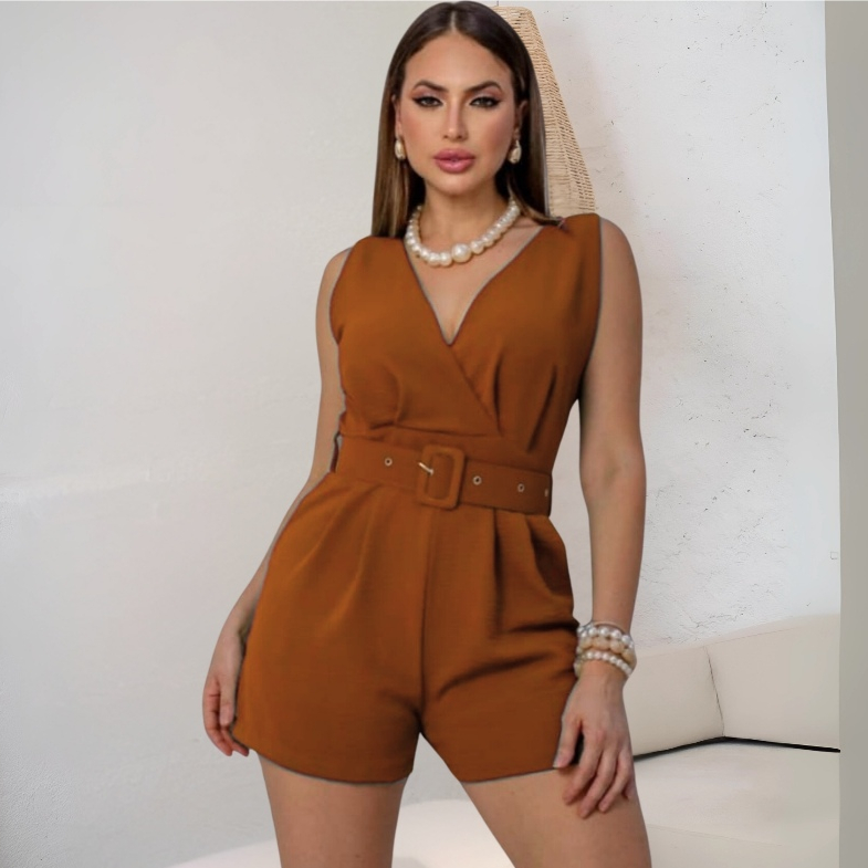 Macaquinho Curto Social Feminino Cinto Bolso Decote V Tecido Duna