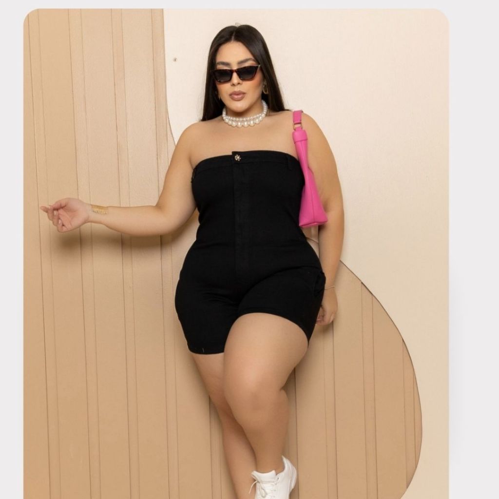 Macaquinho Curto Tomara que caia Jeans e Preto Plus Size.