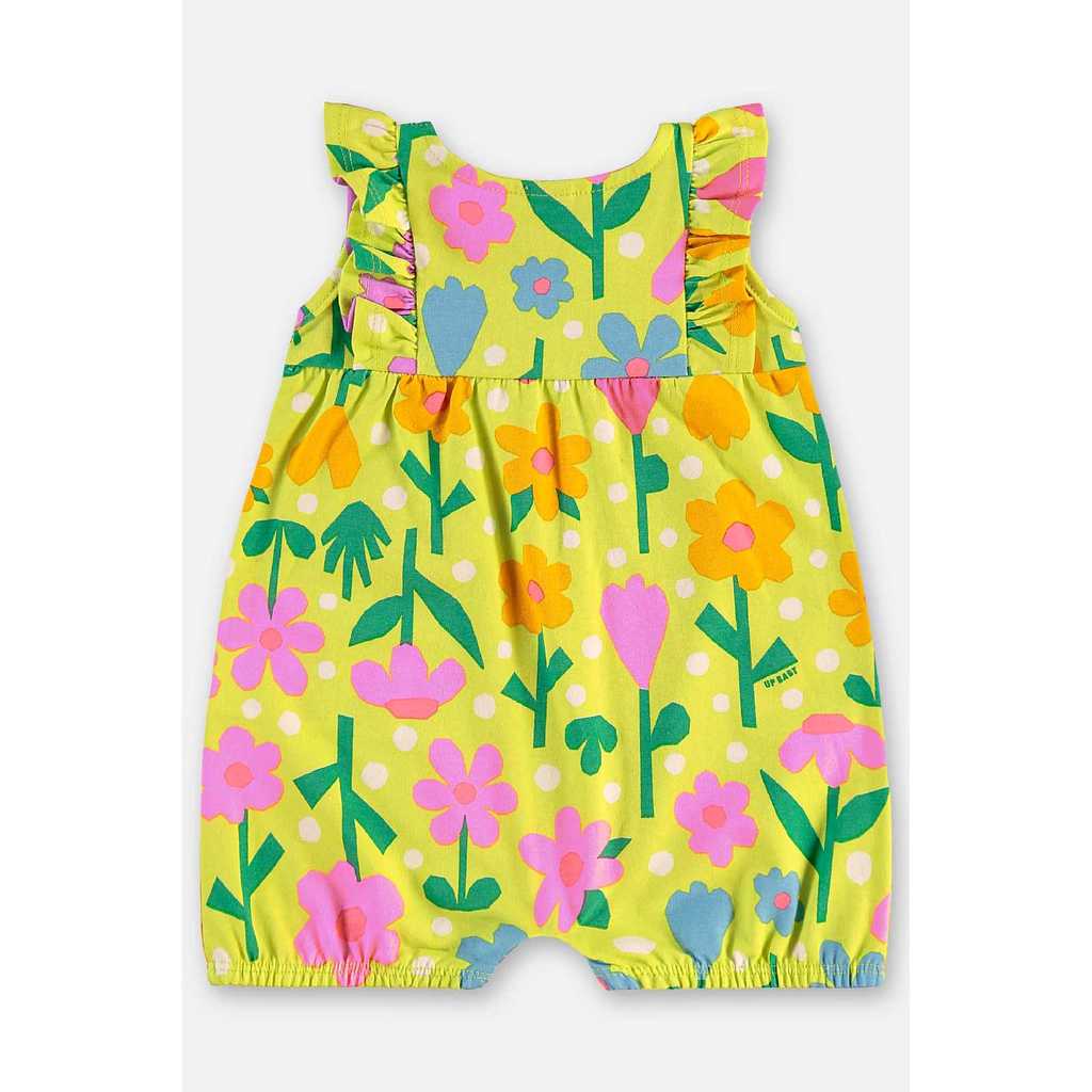 Macaquinho para bebê menina feito em cotton (algodão e elastano) estampado com flores. Possui recorte com franzidos frente/costas, abertura com botões de pressão no peito, gola arredondada, babado aplicado nas cavas, elástico e fechamento entre as pernas por botões de pressão. Macio, confortável e ideal para dias quentes.Tecido: Vestido: Cotton (Algodão) com ElastanoComposição: 96% Algodão e 4% ElastanoModelagem: AmplaComprimento: CurtoForro: NãoCintura: MédiaDecote/Gola: RedondoFechamento: Botão