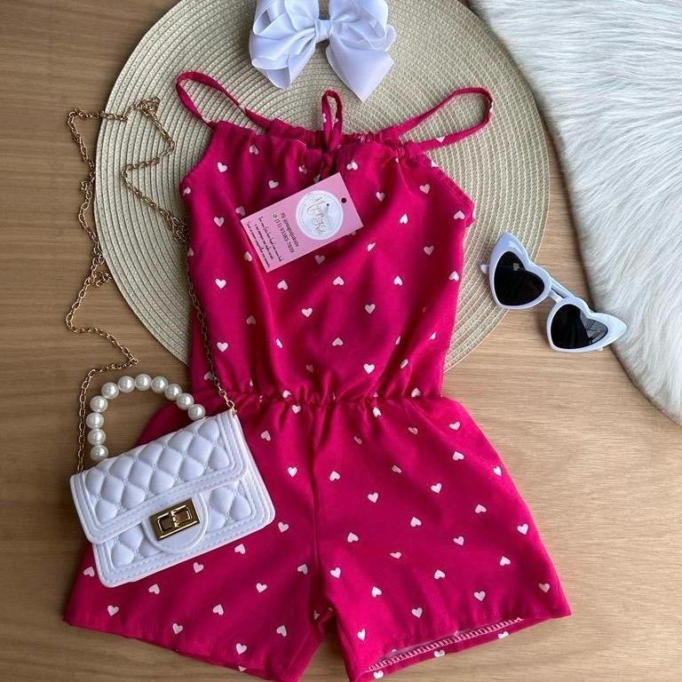Macaquinho estampado com coraçãozinho para meninas estilosas ,cores vivas e vibrantes ,tecido leve e confortável ,tecido não amarrota por ser Duna ,pode lavar sem medo . Esse macacão é a peça chave que está faltando no guarda roupa da sua princesa ,combina com varias ocasiões além de fazer varias combinações e looks.