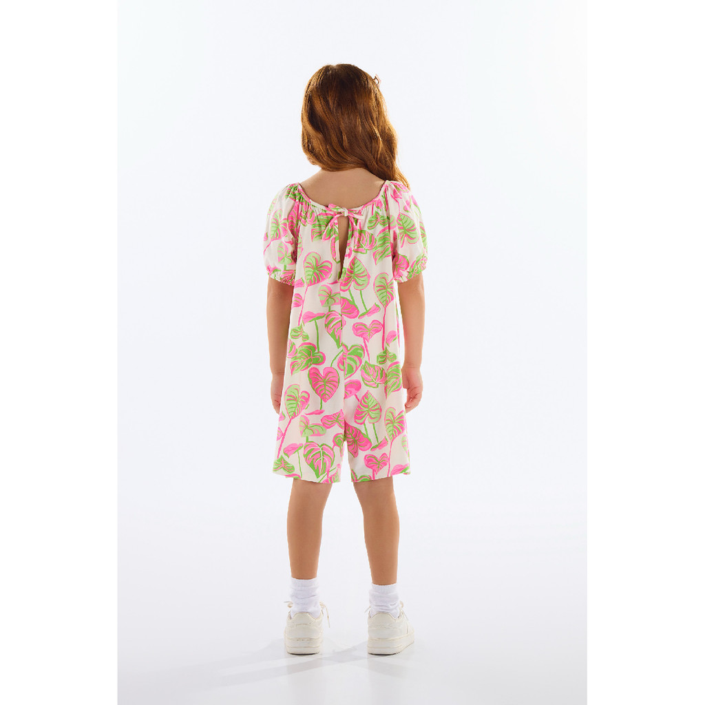 Charmoso e confortável, o macaquinho infantil é confeccionado em cotton estampado com folhagens tropicais. Apresenta mangas curtas bufantes com franzido total, recorte central na frente e costas, e detalhe especial na gola com gota e amarração em laço. Ideal para compor looks leves nos dias mais quentes.Tecido: CottonComposição: 96% Algodão e 4% ElastanoModelagem: JustaComprimento Mangas: CurtaComprimento: CurtoForro: NãoDecote/Gola: RedondoInformações Extras: Possui estampa de folhas